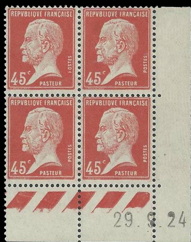 | Commentaire | Pasteur. Voir la vidéo "Histoires de timbres" Émis le 7 août 1924 et retiré dès juin 1925, le Type Pasteur 45 centimes rouge (YT 175) constitue l’une des valeurs intermédiaires de la série Prud’homme, créée pour répondre aux ajustements tarifaires du courrier intérieur au milieu des années 1920. Ce timbre d’usage courant adopte le portrait de Louis Pasteur, gravé et dessiné par Georges Henri Prud’homme, dans un style sobre et académique caractéristique de cette émission. Imprimé en typographie, dentelé 14 × 13½ et tiré en feuilles de 100, il reprend le format standardisé de la série (20 × 24 mm, vignette 18 × 22). Sa teinte rouge le distingue nettement des autres valeurs de la période et facilite son identification dans les oblitérations de 1924–1925, une phase courte durant laquelle il a été utilisé intensivement avant sa suppression rapide. Le 45 c Pasteur s’inscrit dans les collections thématiques « Pasteur », scientifiques, usage courant 1920–1930 et dans les études de tarification postale de l’entre-deux-guerres. Bien que sa période de vente soit brève, son tirage élevé lui confère encore aujourd’hui une valeur modeste, mais il demeure recherché en superbe oblitération ou sur documents tarifaires contemporains. |