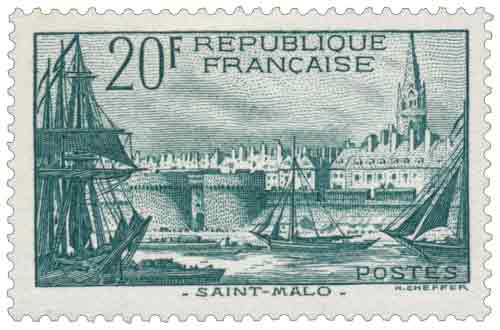 | Commentaire | Visuel : le port de Saint-Malo, classé d'intérêt national, propriété du conseil régional de Bretagne (1er janv.2007). L'avant port et ses voiliers, le rempart et la Grand' Porte, dite "Porte Notre-Dame des remparts", la cité intra-muros avec le clocher de la cathédrale Saint-Vincent- de-Saragosse (édifice de style roman, XIIe au XVIIe siècle, ancienne flèche néogothique bombardée le 6 août 1944, et reconstruite en 1987). Émis le 16 mai 1938 dans la série des sites et monuments, ce timbre de 20 francs vert foncé représente la cité intra-muros de Saint-Malo. Dessiné et gravé en taille-douce par Henry Cheffer, il est imprimé en rotatif sur presses à feuilles de 50 exemplaires. Tiré à 1,5 million d'exemplaires seulement, il correspondait aux tarifs les plus élevés du régime intérieur, tels que les envois recommandés lourds ou les colis postaux. La cité corsaire, ceinte de remparts édifiés et renforcés par Vauban au XVIIe siècle, fut fondée autour de l'évêché légendaire de saint Malo, l'un des sept saints fondateurs de la Bretagne honorés par l'ancien pèlerinage du Tro Breiz que tout Breton se devait d'accomplir au moins une fois. |