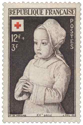 | Commentaire | Ce timbre est grevé d'une surtaxe au profit de la Croix Rouge française Mis en vente en France à partir du 15 décembre 1951 à Paris puis du 17 décembre dans l’ensemble des bureaux du territoire, le timbre gommé de 12 francs assorti d’une surtaxe de 3 francs au profit de la Croix-Rouge française reproduit le portrait d’« Enfant en prière » d’après le Maître de Moulins, artiste de la seconde moitié du XVe siècle aujourd’hui généralement identifié à Jean Hey. Dessiné et gravé en taille-douce par Jules Piel, ce timbre vertical s’inscrit dans la série annuelle de bienfaisance de la Croix-Rouge, qui associe une finalité caritative à la mise en valeur du patrimoine artistique conservé dans les collections nationales, en l’occurrence une œuvre du musée du Louvre. L’iconographie, caractérisée par la sobriété du fond et la précision du modelé, reflète l’influence flamande et annonce la tradition du portrait français, ce qui justifie son choix pour une émission culturelle à large diffusion. Affecté à des usages postaux courants de faible affranchissement, ce timbre illustre la politique philatélique française du début des années 1950, combinant soutien humanitaire, diffusion artistique et usage postal effectif.