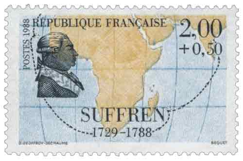 | Commentaire | Figure majeure de la marine française du XVIIIe siècle, Pierre André de Suffren, dit le bailli de Suffren, occupe une place singulière dans l’histoire navale par son tempérament, ses choix tactiques et son refus des conventions. Issu d’une ancienne famille provençale, il s’engage très jeune dans la Marine royale avant de servir dans l’ordre de Saint-Jean de Jérusalem, expérience qui forge son goût de l’action et son endurance au combat. Réintégré dans la marine française, il se distingue lors de la prise de Mahon puis, surtout, pendant la guerre d’Indépendance américaine, où il commande des bâtiments engagés dans les Caraïbes et l’océan Indien. Ce timbre s’inscrit dans la série consacrée aux marins et explorateurs, reflétant la volonté de l’administration postale française de rappeler le rôle stratégique joué par ses officiers de marine dans l’affirmation maritime du royaume. Suffren y apparaît comme un chef audacieux, réputé pour son autorité parfois brutale envers ses officiers mais profondément attentif à ses équipages, dont il obtient une fidélité sans faille. Ses campagnes contre la flotte britannique, notamment face à l’amiral Edward Hughes, marquent une rupture dans les pratiques navales de l’époque par une recherche constante de l’initiative et de l’engagement direct. Le contexte de l’émission, en 1988, correspond au bicentenaire de sa disparition et s’inscrit dans une politique commémorative visant à mettre en valeur les grandes figures militaires françaises. Ce timbre rappelle ainsi l’héritage maritime de la France et la mémoire d’un officier dont la carrière, achevée peu avant la Révolution, symbolise à la fois l’excellence navale et les tensions de l’Ancien Régime. Article rédigé pour WikiTimbres |