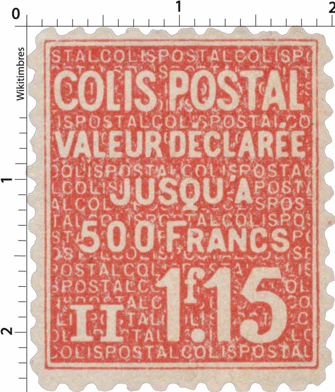 Timbre : 1939 COLIS POSTAL VALEUR DÉCLARÉE Jusqu'à 500 francs Mesures Format d'imp 18 x 22 mm Dents incluses 20 x 24 mm Forme vertical Phosphore Non Impression Typographie Complément xxxxx Couleur rouge Valeur 1f15 Dentelure 11 Emis en - Quantité - Auteurs Dessinateur xxxxx Graveur xxxxx Mise en page xxxxx Mentions - Numéros & Dates N° Philatelix CP151 N° Michel - Date d'émission 01/01/1939 Date de retrait - Classements Groupe Colis postaux 1939 Catégorie Colis postaux Familles Usage - Régions - Départements - Description Colis postaux Commentaire - Mes timbres & notes personnelles www.wikitimbres.fr