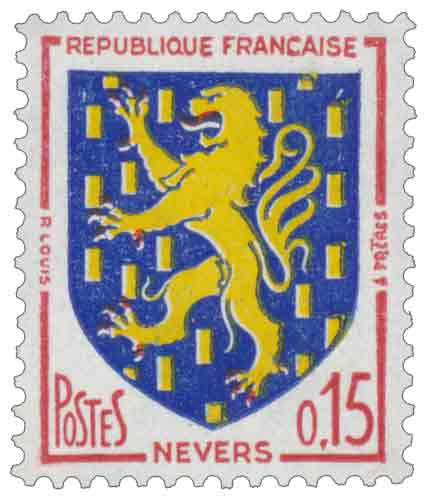 | Commentaire | Émis en France en 1962 dans le cadre de la sixième série des Armoiries des villes de France, le timbre-poste gommé consacré aux armoiries de la ville de Nevers s’inscrit dans la politique philatélique des années 1960 visant à valoriser l’identité municipale et héraldique des chefs-lieux et villes historiques françaises à travers des figurines de petit format adaptées à des usages postaux précis ; mis en vente générale le 23 juillet 1962, ce timbre de 0,15 franc correspond au tarif d’affranchissement des journaux, ce qui explique son emploi régulier dans le courrier imprimé et sa longévité au guichet, malgré son rattachement à une série thématique bien identifiée ; dessiné par Robert Louis et gravé par André Frères, il est imprimé en typographie rotative, technique alors privilégiée pour les émissions de grande diffusion à vocation utilitaire, et ses couleurs rouge, bleu et jaune permettent une restitution claire des armes de Nevers, héritées des comtes et ducs du Nivernais et blasonnées « d’azur semé de billettes d’or au lion du même, armé et lampassé de gueules », rappelant le rôle historique de la ville comme capitale provinciale sous l’Ancien Régime et comme centre administratif durablement ancré dans l’organisation territoriale de la France, faisant de ce timbre une illustration représentative des émissions françaises de 1962 associant rationalisation postale et mise en valeur du patrimoine local. |