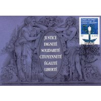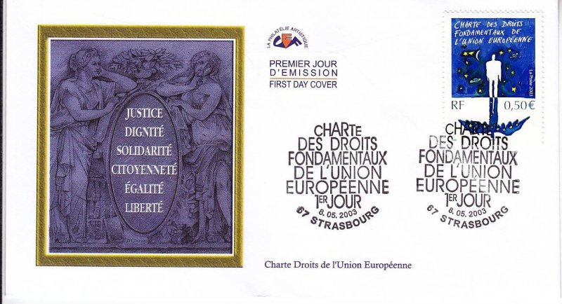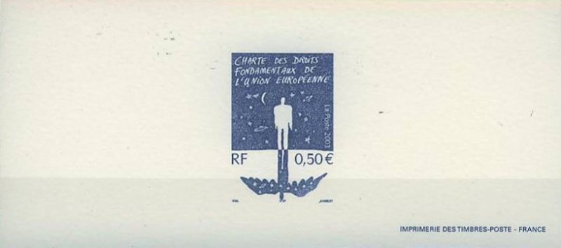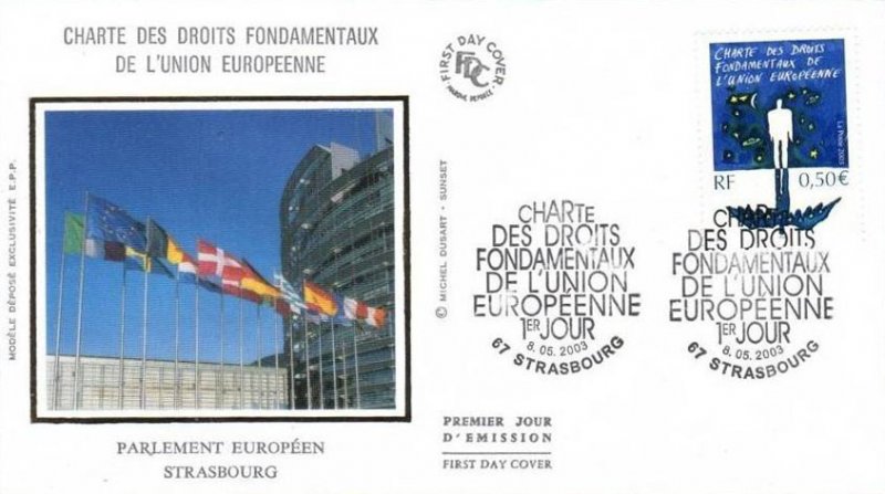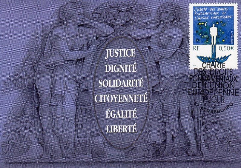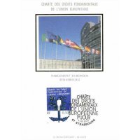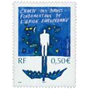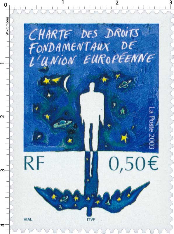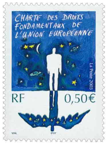 | Commentaire | Description synthétique du visuel du timbre : La Charte des droits fondamentaux de l’Union Européenne reprend l’ensemble des droits civiques, politiques, économiques et sociaux des citoyens européens et de toute personne vivant sur le territoire de l’Union. Elle a été signée et proclamée le 07 décembre 2000 par les Présidents du Parlement européen, de la Commission européenne et du Conseil européen. Les droits fondamentaux sont regroupés selon 6 grands axes : dignité, liberté, égalité, solidarité, citoyenneté et justice. 54 articles énoncent les droits, les libertés et les principes adoptés. |