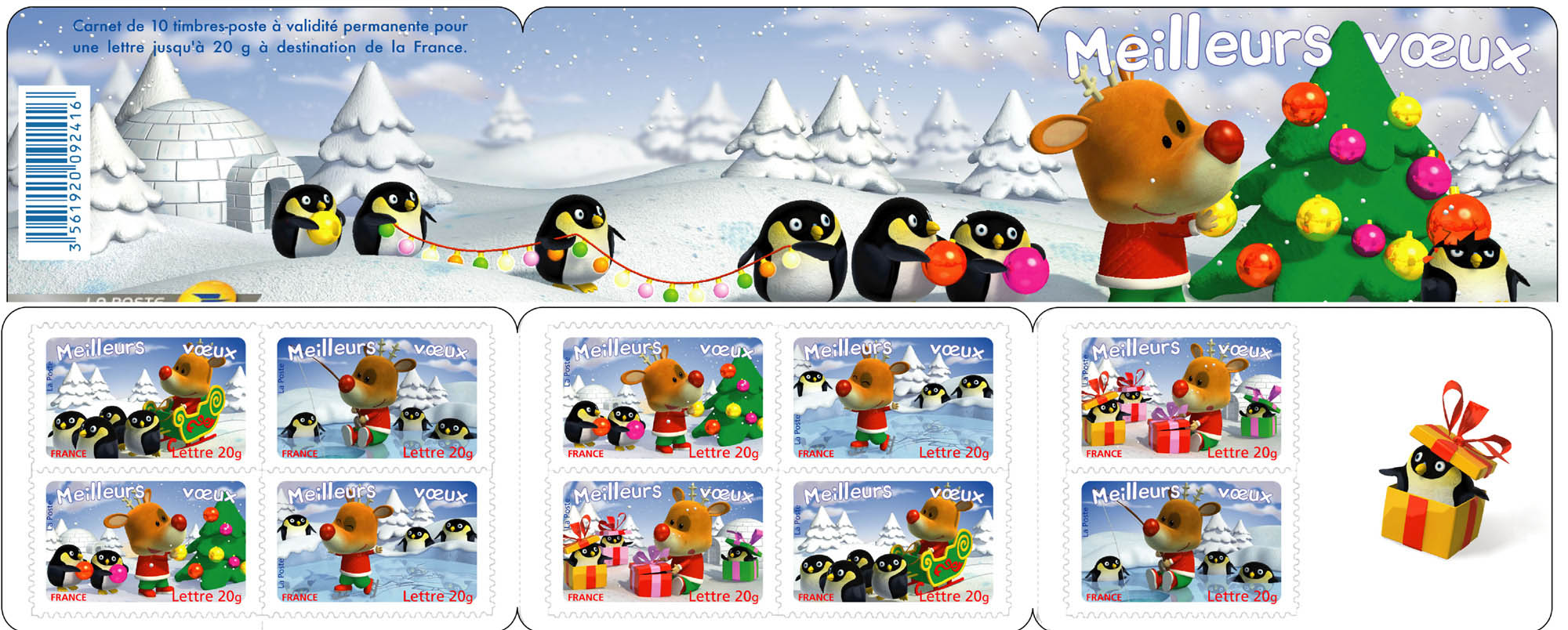| Commentaire | MEILLEURS VŒUX Notre « renne » ce héros accompagné de ses acolytes les pingouins. Suivez leurs aventures autour de ces 5 timbres. Timbre sans millésime |