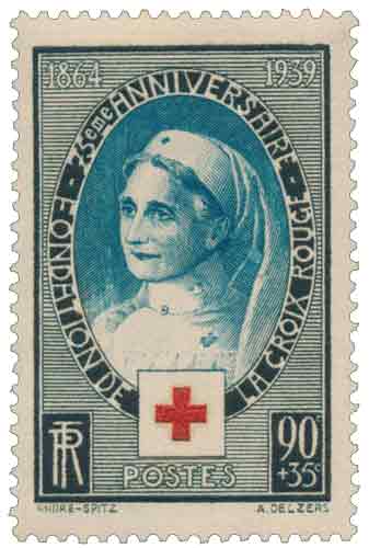 | Commentaire | Croix-Rouge - 75e anniversaire de la fondation de la Croix-Rouge. Ce timbre est grevé d'une surtaxe au profit de la Croix Rouge française Émis le 24 mars 1939 en taille-douce rotative trichrome sur feuilles de 25 exemplaires, à 1,4 million d'exemplaires dont 700 000 vendus, ce timbre semi-postal vertical dentelé 13 en noir, bleu et rouge, premier timbre-poste français imprimé en trois couleurs simultanées par un procédé innovant mis au point par Serge Beaune, portait une valeur faciale 90 c + 35 c correspondant au tarif des lettres simples pour l'intérieur tandis que la surtaxe bénéficiait à la Croix-Rouge française pour son 75e anniversaire. Dessiné par André Spitz et gravé par Antonin Delzers, il représente le portrait de Mlle Gervais, infirmière à l'hôpital du Mont des Oiseaux pendant la Première Guerre mondiale, choisie par l'artiste pour symboliser le dévouement humanitaire face à une demande initiale de motif plus abstrait, dans un contexte où l'organisation fondée en 1864 renforçait son rôle d'assistance aux victimes à l'approche d'un nouveau conflit. |