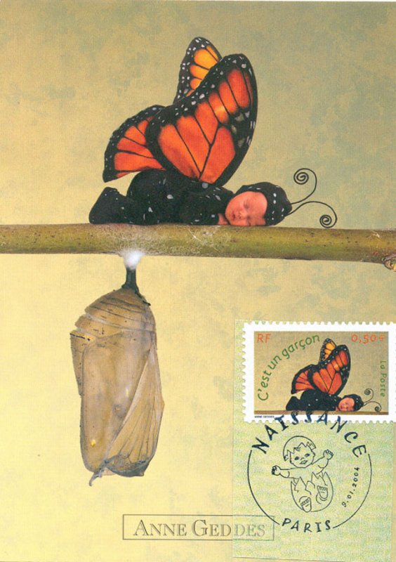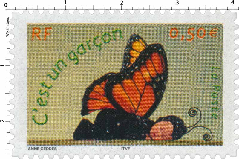 | Commentaire | Timbre pour naissance Émis en carnet, timbre auto-adhésif. Anne Geddes est une artiste photographe australienne. Elle met en scène des photos originales et élégantes de bébés, souvent des nouveaux nés, le plus jeune n’avait pas plus de deux jours. |