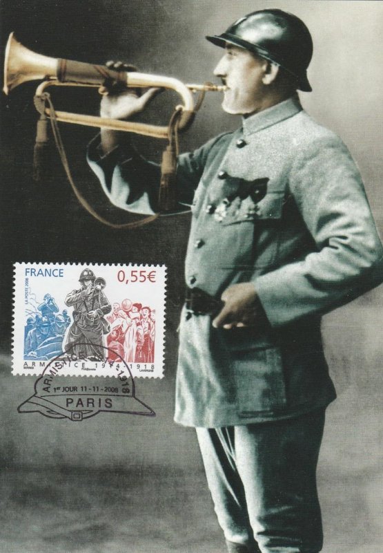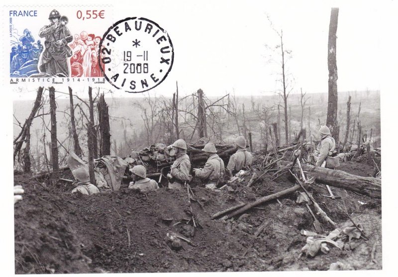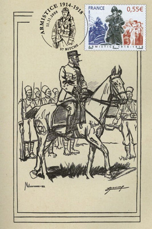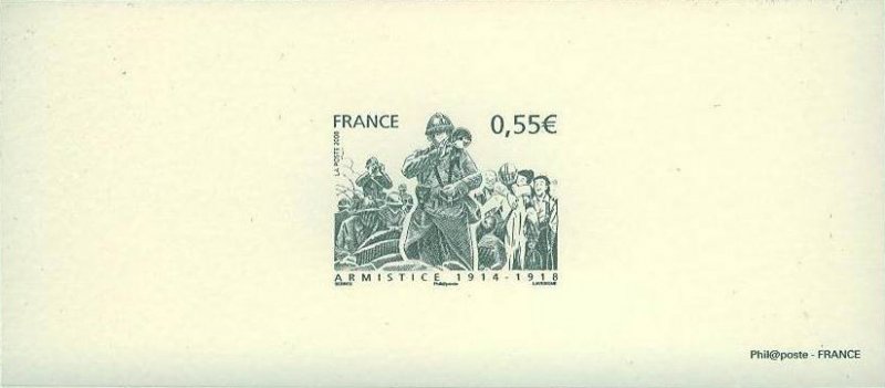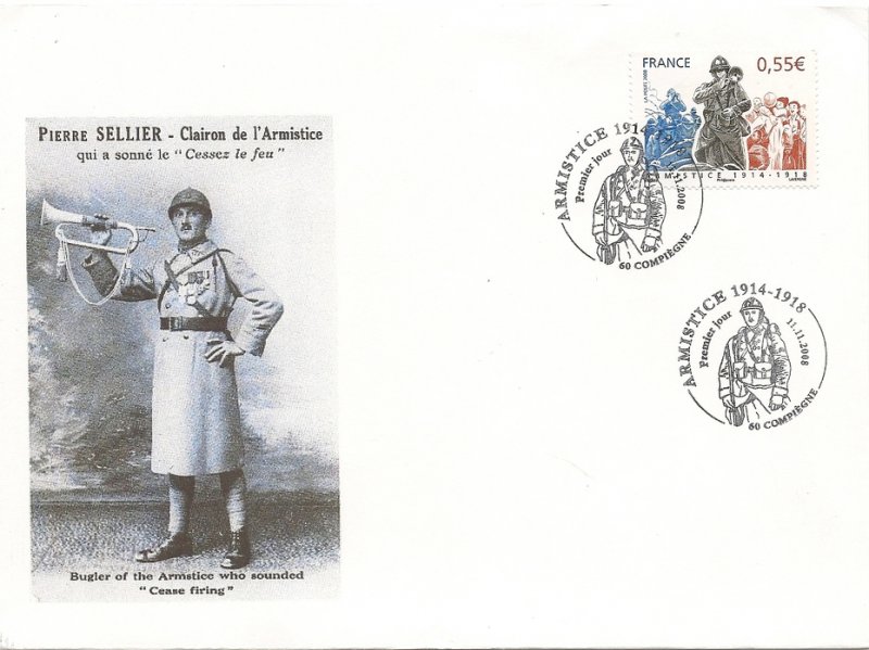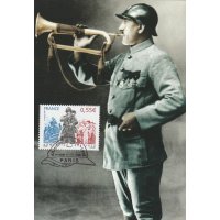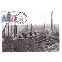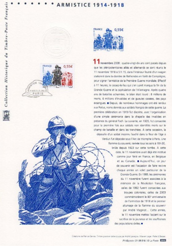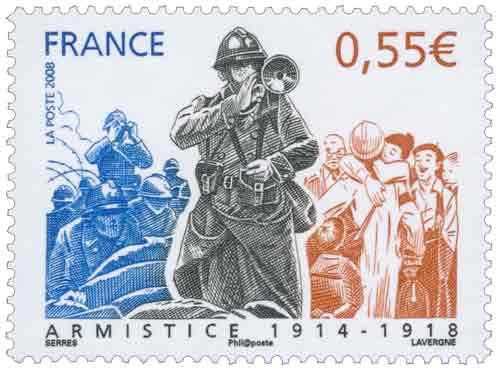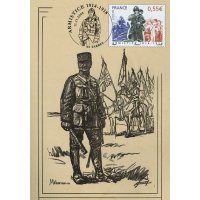 | Commentaire | La mise en vente anticipée a lieu le 11 novembre à l'Hôtel national des Invalides à Paris, à Compiègne près de la clairière de Rethondes où l'armistice fut signée, et à Verdun. D'autres bureaux proposent le timbre, mais leur cachet ne porte pas la mention « premier jour » : Bitche, Sedan, dans la maison natale du maréchal Ferdinand Foch à Tarbes, Tournefeuille, Vitry-le-François. Les timbres à date de Claude Perchat et André Lavergne soit représentent un poilu, soit ont la forme d'un casque de soldat français de l'époque[ |