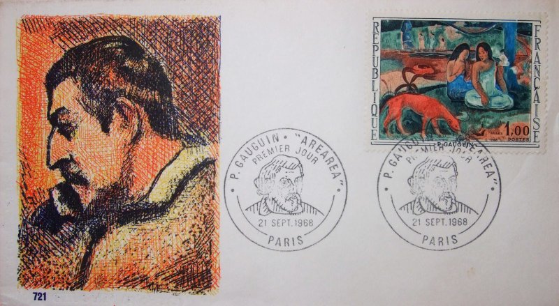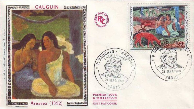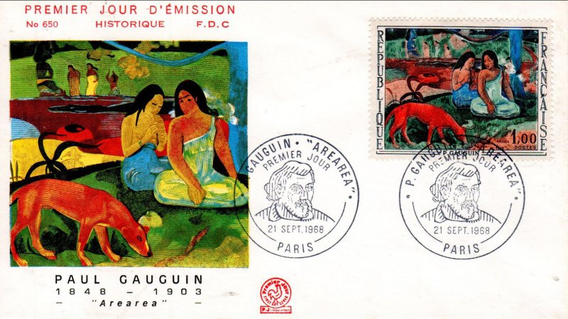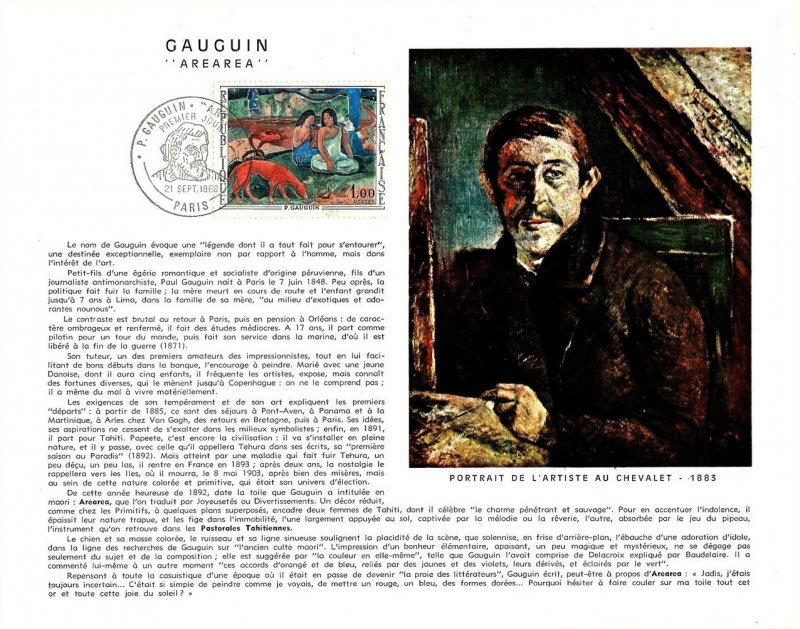 | Commentaire | Tu veux que je te parle d’un gars qui a tout envoyé balader pour suivre ses couleurs ? Paul Gauguin. Ouais, celui-là même. Un banquier devenu peintre, un père de famille qui plaque tout pour partir à l’autre bout du monde avec un pinceau, une idée un peu floue du paradis et une fascination énorme pour les îles. Il est né à Paris, mais pas resté longtemps. À 7 ans, il était déjà à Lima, élevé par des nourrices péruviennes – ça marque. Plus tard, il embarque sur un navire, fait le tour du monde, sert dans la marine… et finit par bosser dans une banque. Une vie bien rangée ? En apparence. Parce qu’en coulisses, il peint. Il expérimente. Et ça bout à l’intérieur. Un jour, il plaque tout. Direction la Bretagne, puis les tropiques. Panama, Martinique, Arles avec Van Gogh (ça a dû être rock’n’roll), puis enfin : Tahiti. Mais pas la carte postale. La vraie. Celle où tu marches pieds nus, où la lumière est crue, où les traditions anciennes murmurent encore. C’est là qu’il peint Arearea. Un mot maori qu’on pourrait traduire par “divertissement” — mais c’est plus profond que ça. Sur la toile, deux femmes tahitiennes. Une flûte. Un chien. Des couleurs qui vibrent comme un chant. Pas de perspective classique, pas de lumière “européenne”. Tout est plat, simple, presque sacré. En fond, une scène étrange — peut-être un rite ? On sent que Gauguin cherche plus qu’une image : une vérité, ou au moins, un apaisement. Il reviendra en France, repartira. Malade. Ruiné. Mais fidèle à lui-même. Il écrira : « Pourquoi hésiter à faire couler sur ma toile tout cet or et toute cette joie du soleil ? » Franchement ? Il a bien fait. WikiTimbres |