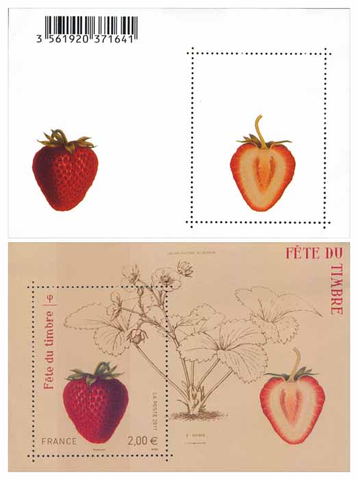 | Commentaire | C’est une estampe botanique intitulée “Fraisier Rubis” qui illustre le bloc Fête du timbre 2011. Elle est issue du fond du Muséum National d’Histoire Naturelle. Elle a été réalisée par le peintre Alfred Riocreux et gravée par Philibert Picart. Ce bloc présente de nombreuses aspérités : taille-douce, parfum ainsi qu’une impression recto / verso. Timbre à date de la Fête du timbre “Premier Jour” conçu par Étienne Théry |