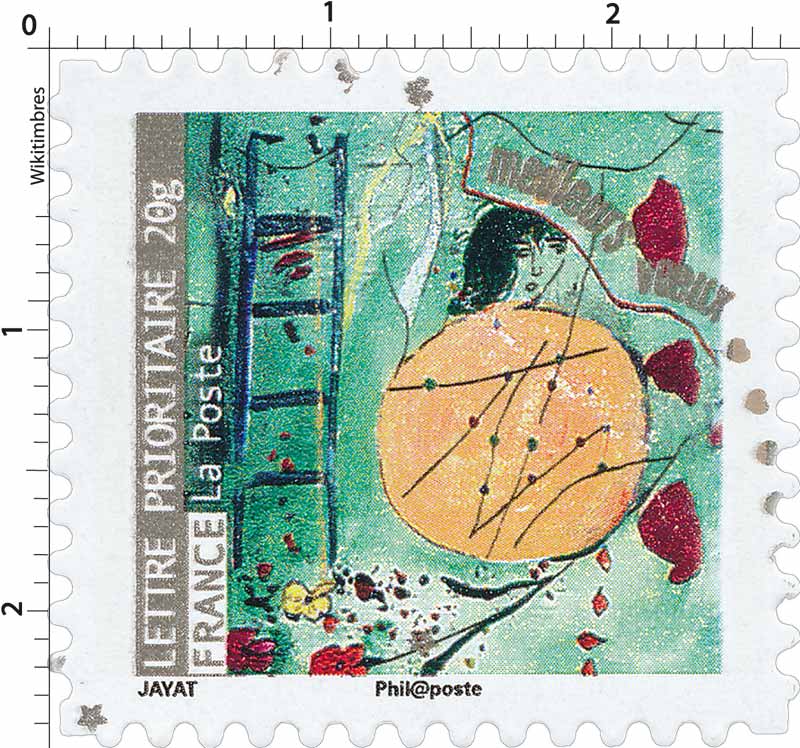 | Commentaire | La mise en vente anticipée a lieu les 7 et 8 novembre au Salon philatélique d'automne, à Paris. Le timbre à date premier jour par Marot représente une femme soufflant sur un pissenlit, les aigrettes se dispersant autour des mots-messages « Amitié, amour, bonheur, santé ». Timbre sans millésime |
