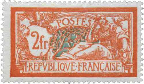 | Commentaire | Le 2 francs Merson orange et vert-bleu, mis en vente le 4 juin 1920, appartient à la dernière génération des timbres d’usage courant au type Merson, utilisés pour les affranchissements de forte valeur au début du XXᵉ siècle. Dessiné par Luc-Olivier Merson et gravé par Auguste Thévenin, ce timbre bicolore de format large (40 × 24 mm, dentelé 13½ × 14) illustre la continuité du style allégorique initié en 1900. Le motif représente la République assise, gardienne de la Paix, entourée d’attributs symbolisant la stabilité, la souveraineté et la prospérité nationale. L’impression bicolore en typographie, réalisée en deux passages successifs, donne à cette valeur une palette contrastée — orange pour le cadre, vert-bleu pour le centre — source de nombreuses variétés d’encrage et de décalages appréciées des spécialistes. Émis en feuilles de 75, le 2 F Merson répond à la hausse progressive des tarifs postaux de l’après-guerre, notamment pour les colis, les valeurs déclarées et les correspondances internationales. Resté très longtemps en service, il n’est retiré de la vente qu’en décembre 1931, ce qui en fait l’une des valeurs les plus durablement utilisées du type Merson. Référencé YT n° 145, ce timbre constitue une pièce incontournable pour comprendre l’évolution des affranchissements élevés au cours de l’entre-deux-guerres. |