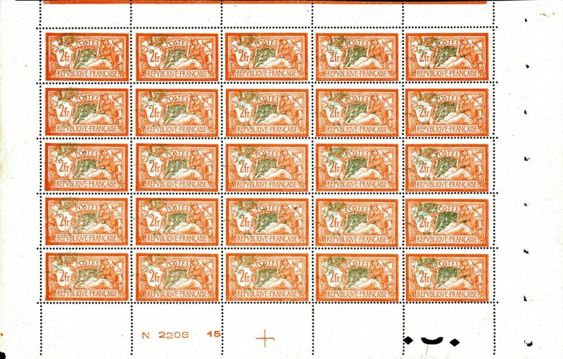 | Commentaire | Le 2 francs Merson orange et vert-bleu, mis en vente le 4 juin 1920, appartient à la dernière génération des timbres d’usage courant au type Merson, utilisés pour les affranchissements de forte valeur au début du XXᵉ siècle. Dessiné par Luc-Olivier Merson et gravé par Auguste Thévenin, ce timbre bicolore de format large (40 × 24 mm, dentelé 13½ × 14) illustre la continuité du style allégorique initié en 1900. Le motif représente la République assise, gardienne de la Paix, entourée d’attributs symbolisant la stabilité, la souveraineté et la prospérité nationale. L’impression bicolore en typographie, réalisée en deux passages successifs, donne à cette valeur une palette contrastée — orange pour le cadre, vert-bleu pour le centre — source de nombreuses variétés d’encrage et de décalages appréciées des spécialistes. Émis en feuilles de 75, le 2 F Merson répond à la hausse progressive des tarifs postaux de l’après-guerre, notamment pour les colis, les valeurs déclarées et les correspondances internationales. Resté très longtemps en service, il n’est retiré de la vente qu’en décembre 1931, ce qui en fait l’une des valeurs les plus durablement utilisées du type Merson. Référencé YT n° 145, ce timbre constitue une pièce incontournable pour comprendre l’évolution des affranchissements élevés au cours de l’entre-deux-guerres. |