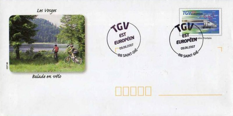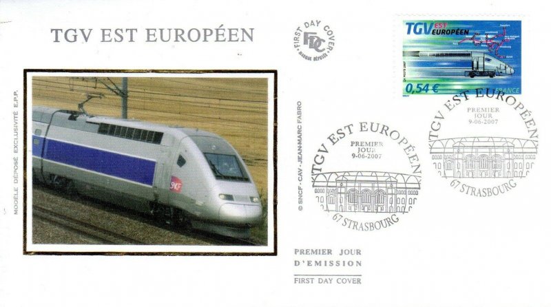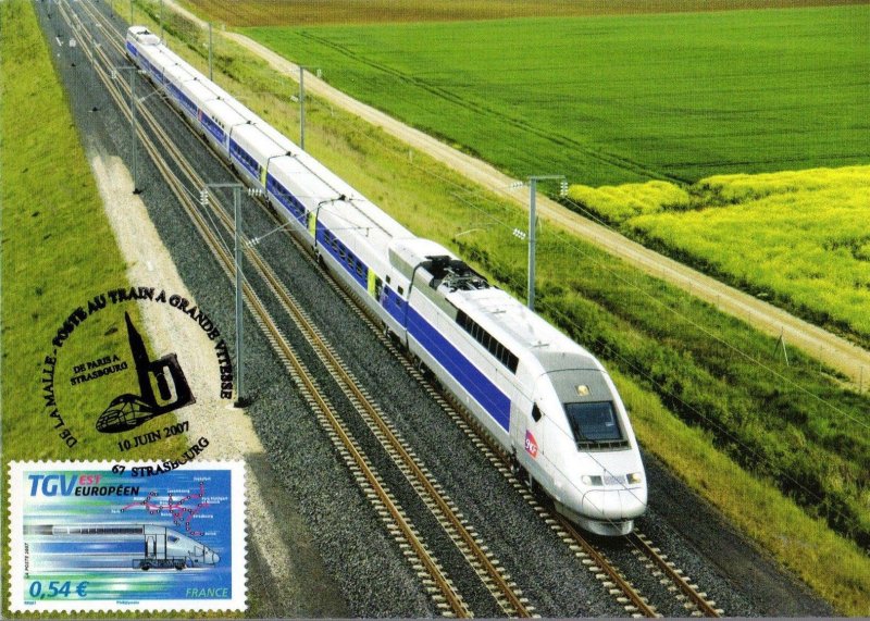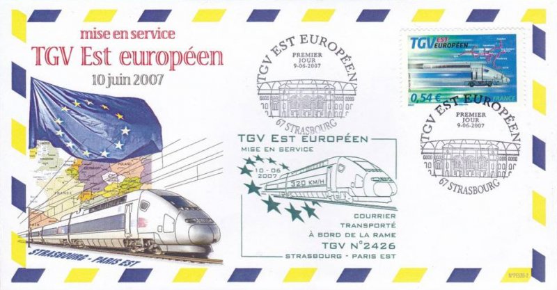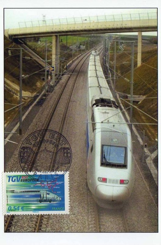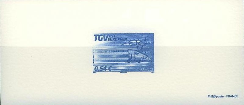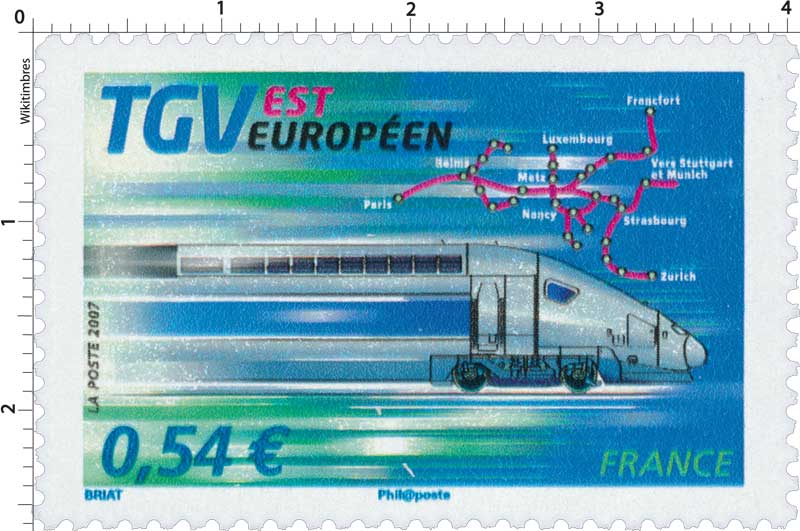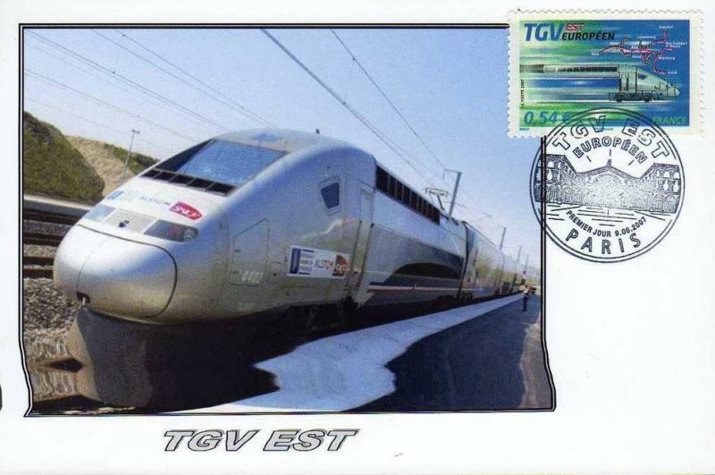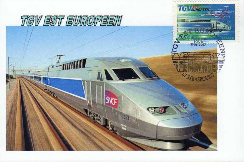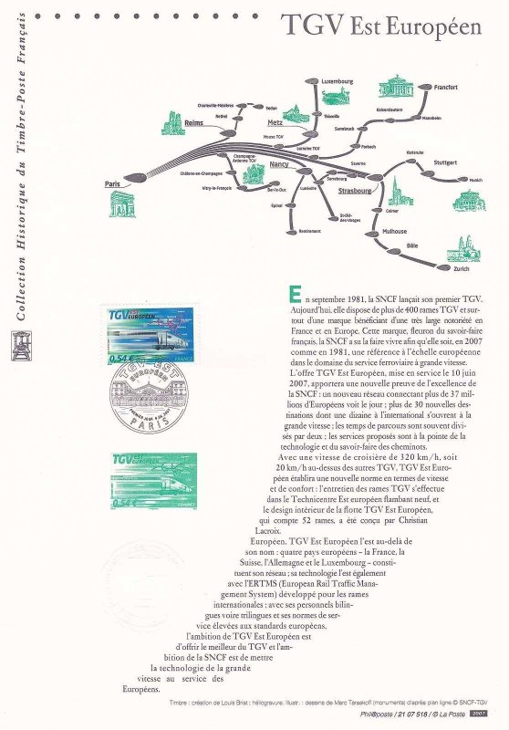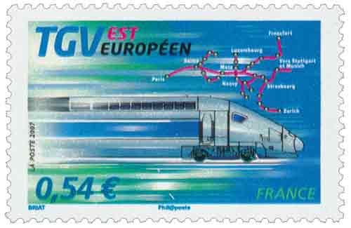 | Commentaire | Le TGV Est européen sera inauguré en juin 2007 et proposera de nouvelles liaisons à grande vitesse ouvertes sur tout l’Est de la France et au-delà des frontières en Allemagne, Suisse et Luxembourg. Il redessinera la France et l’Europe, contribuera à la construction de l’Europe à grande vitesse tout en illustrant le savoir-faire de la France dans ce domaine. Le visuel présente la livrée POS des rames TGV et les liaisons est européennes auxquelles elles seront affectées. |