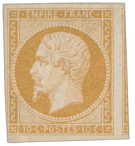 | Commentaire | Napoléon III - Empire Franc. Type I, 1er tirage. Émis en décembre 1853, le 10 centimes bistre type I marque la première apparition de cette valeur faciale sous le régime impérial naissant. Il s’agit d’un timbre de transition : bien que désormais légendé « EMPIRE FRANC », il est encore gravé à partir du poinçon de l’émission Présidence, conçu pour Louis-Napoléon Bonaparte avant son couronnement. Ce poinçon, réutilisé sans retouche majeure, permet d’identifier les exemplaires de type I par plusieurs détails caractéristiques, dont la facture générale héritée des derniers Cérès et des premiers Président. Jean-Jacques Barre supprime pour cette nouvelle série l’initiale « B », qui figurait auparavant sous le cou, tout en conservant la structure graphique du médaillon. Ce même poinçon de Présidence a également servi pour établir les premières planches des 5 c, 25 c, 40 c, 80 c et 1 franc, ainsi que pour les premières émissions du 10 c (13A) et du 20 c (14A), ce qui explique les proximités stylistiques entre toutes ces valeurs du début de l’Empire. Le 10 centimes devient alors la valeur d’usage courant pour l’affranchissement des correspondances légères circulant dans la même ville ou dans le même arrondissement postal, conformément aux tarifs en vigueur jusqu’à la réforme du 25 mai 1854. Avec la baisse générale des tarifs cette année-là, plusieurs valeurs deviennent obsolètes — notamment le 25 c et le 1 franc — mais le 10 c conserve une place centrale dans les affranchissements intérieurs. Imprimé en typographie, non dentelé, et relativement abondant, le n°13A se reconnaît par sa teinte bistre typique des premiers tirages impériaux. Les oblitérations caractéristiques de la période sont les losanges Petits Chiffres, parfois remplacés à Paris par l’étoile muette. Ce timbre inaugure la longue série des 10 centimes de l’Empire, avant l’apparition du type II, gravé sur un poinçon corrigé et aujourd’hui nettement différencié dans la philatélie spécialisée. |
