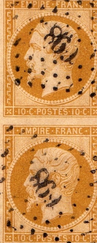 | Commentaire | Napoléon III - Empire Franc. Type I, 1er tirage. Émis en décembre 1853, le 10 centimes bistre type I marque la première apparition de cette valeur faciale sous le régime impérial naissant. Il s’agit d’un timbre de transition : bien que désormais légendé « EMPIRE FRANC », il est encore gravé à partir du poinçon de l’émission Présidence, conçu pour Louis-Napoléon Bonaparte avant son couronnement. Ce poinçon, réutilisé sans retouche majeure, permet d’identifier les exemplaires de type I par plusieurs détails caractéristiques, dont la facture générale héritée des derniers Cérès et des premiers Président. Jean-Jacques Barre supprime pour cette nouvelle série l’initiale « B », qui figurait auparavant sous le cou, tout en conservant la structure graphique du médaillon. Ce même poinçon de Présidence a également servi pour établir les premières planches des 5 c, 25 c, 40 c, 80 c et 1 franc, ainsi que pour les premières émissions du 10 c (13A) et du 20 c (14A), ce qui explique les proximités stylistiques entre toutes ces valeurs du début de l’Empire. Le 10 centimes devient alors la valeur d’usage courant pour l’affranchissement des correspondances légères circulant dans la même ville ou dans le même arrondissement postal, conformément aux tarifs en vigueur jusqu’à la réforme du 25 mai 1854. Avec la baisse générale des tarifs cette année-là, plusieurs valeurs deviennent obsolètes — notamment le 25 c et le 1 franc — mais le 10 c conserve une place centrale dans les affranchissements intérieurs. Imprimé en typographie, non dentelé, et relativement abondant, le n°13A se reconnaît par sa teinte bistre typique des premiers tirages impériaux. Les oblitérations caractéristiques de la période sont les losanges Petits Chiffres, parfois remplacés à Paris par l’étoile muette. Ce timbre inaugure la longue série des 10 centimes de l’Empire, avant l’apparition du type II, gravé sur un poinçon corrigé et aujourd’hui nettement différencié dans la philatélie spécialisée. |