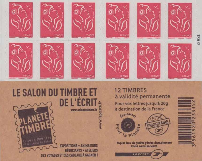 | Description | Carnet Marianne Lamouche “Salon du Timbre et de l’Écrit 2008”12 TVP Lettre 20 g |