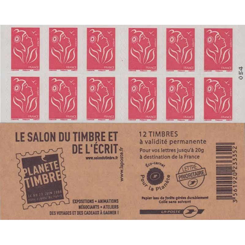 | Description | Carnet Marianne Lamouche “Salon du Timbre et de l’Écrit 2008”12 TVP Lettre 20 g |