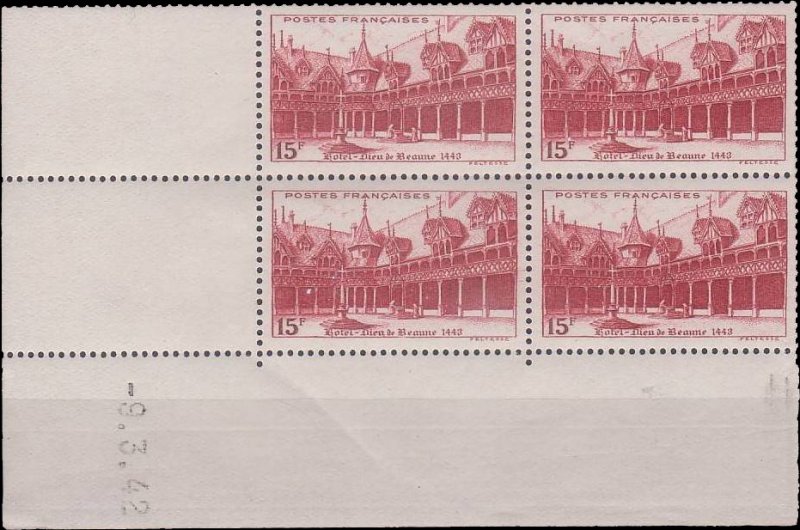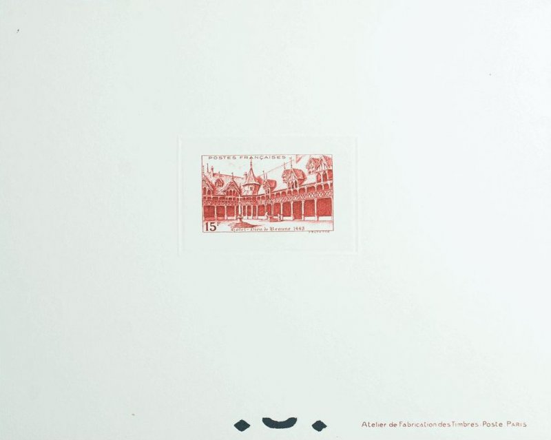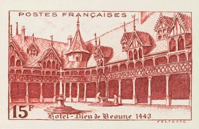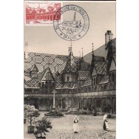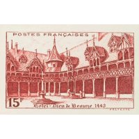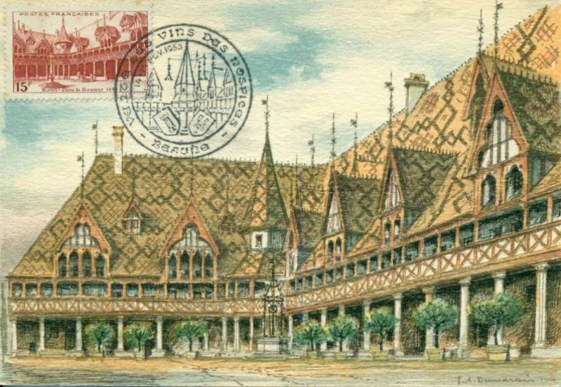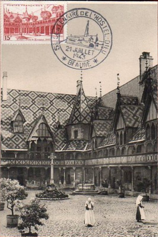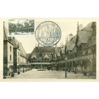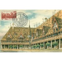 | Commentaire | Visuel : la cour intérieure, de style gothique flamboyant, avec ses toitures polychromes en tuiles vernissées de Bourgogne et leurs lucarnes aériennes, fondé par Nicolas Rollin (1376-1462, chancelier de Philippe le Bon, duc de Bourgogne) et son épouse Guigone de Salins (1403-1470). |