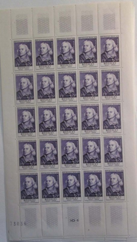 | Commentaire | Ce timbre est grevé d'une surtaxe au profit de la Croix-Rouge française Émis en France en 1954 dans une série de six timbres de bienfaisance au profit de la Croix-Rouge française consacrée à des personnages célèbres du XIIIᵉ au XXᵉ siècle, le timbre-poste gommé représentant Jacques-Bénigne Bossuet s’inscrit dans une émission commémorative associant mémoire culturelle et usage postal courant par l’adjonction d’une surtaxe. Mis en vente générale le 12 juillet 1954, ce timbre de 15 francs majoré de 5 francs occupe une place cohérente au sein de la série, dédiée à des figures marquantes de l’histoire intellectuelle, religieuse et artistique française, et relève des émissions de bienfaisance de l’après-guerre. Le sujet évoque Bossuet, évêque de Meaux, prédicateur et écrivain du XVIIᵉ siècle, dont l’éloquence sacrée et l’influence doctrinale ont durablement marqué la vie religieuse et intellectuelle du règne de Louis XIV, notamment par ses oraisons funèbres et ses écrits théologiques, références majeures de la prose classique française. L’iconographie, traitée en taille-douce, s’inscrit dans la tradition philatélique française de portraits solennels, adaptée à un format vertical favorisant la lisibilité et la gravité du sujet, tandis que la finalité caritative de la surtaxe rattache ce timbre à une pratique postale où l’hommage culturel se double d’un soutien humanitaire ; à titre d’information consensuelle, la série complète a été tirée à parts égales pour chacune des figurines, conditionnant la diffusion de ce portrait de Bossuet dans les usages postaux de 1954. |