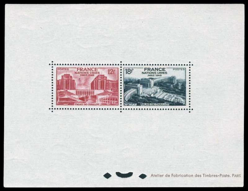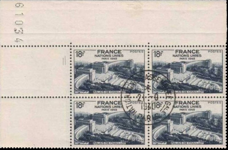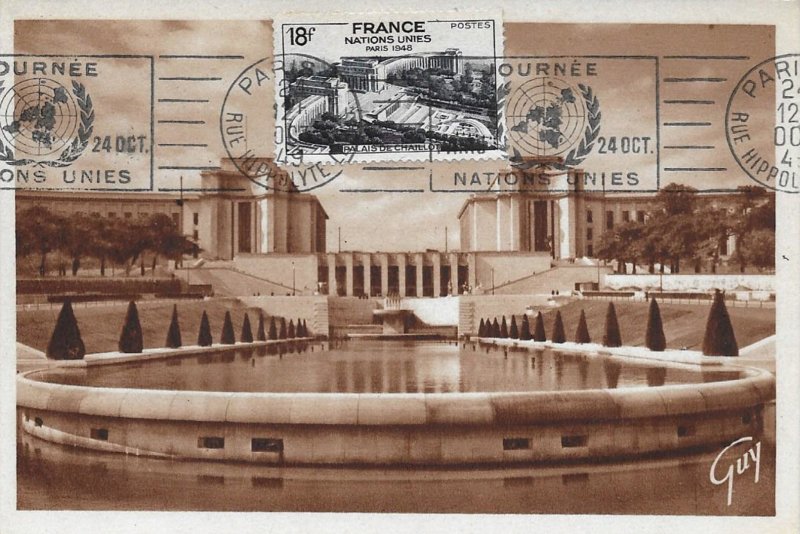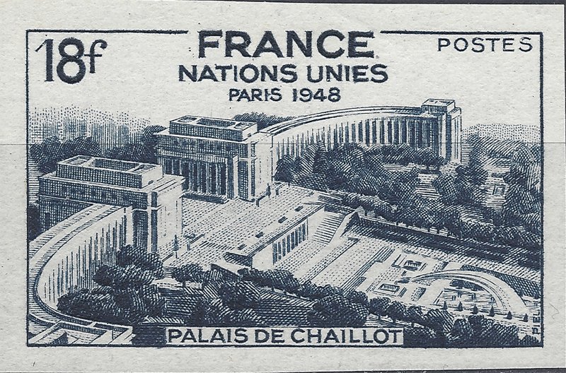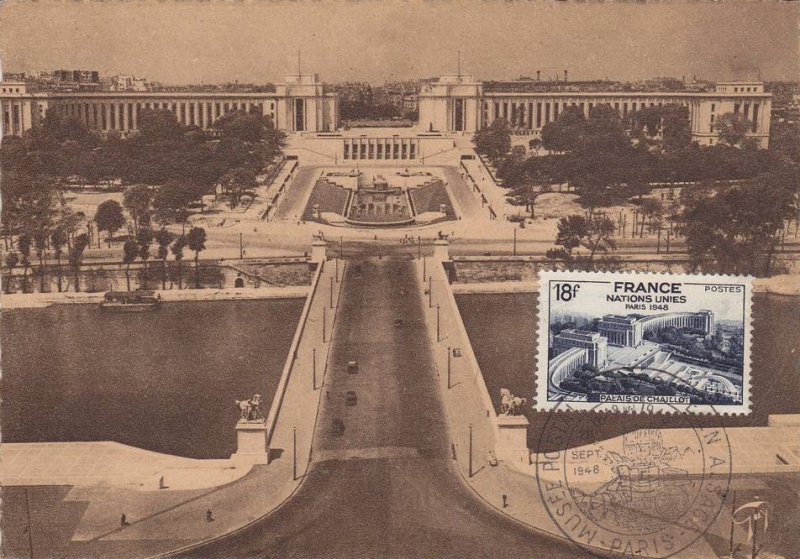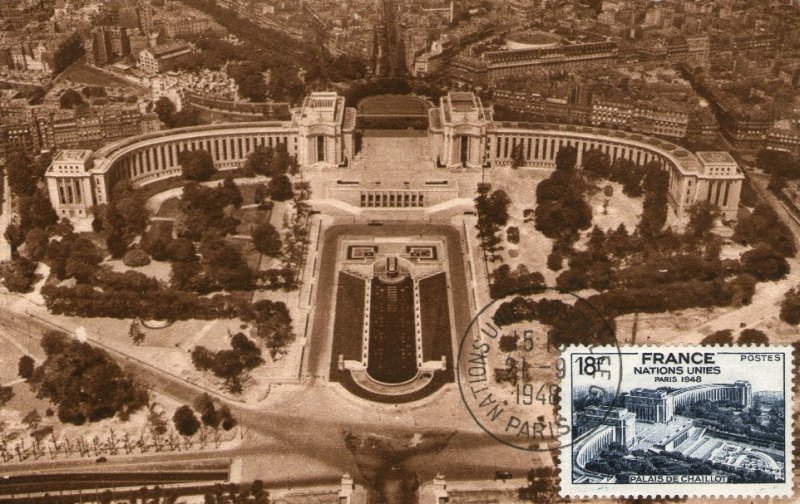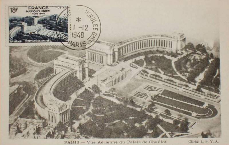 | Commentaire | Palais de Chaillot - Nations Unies - Paris 1948 Visuel : Palais réalisé pour l'Exposition universelle de 1937 (architectes : Léon Azéma (1888-1978), Jacques Carlu (1890-1976) et Louis-Hippolyte Boileau (1878-1948) édifié à la place du Palais du Trocadéro de l'Exposition universelle de 1878. (architectes : Gabriel Davioud (1824-1881) et Jules Bourdais (1835-1915). |