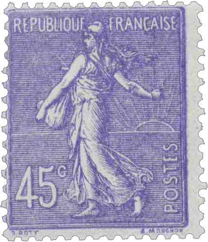 | Commentaire | Semeuse lignée. Nota Les ombres portées sur la Semeuse sont mal positionnées par rapport au soleil, de plus elle sème contre le vent Émis en novembre 1926 et maintenu en circulation jusqu’en juin 1932, le 45 centimes lilas du type Semeuse lignée constitue l’une des valeurs emblématiques de la fin des années 1920. Gravé par Louis-Eugène Mouchon d’après l’œuvre d’Oscar Roty, ce timbre reprend la célèbre allégorie de La Semeuse semant à contre-vent, ici sur fond ligné, caractéristique visuelle propre à cette série.