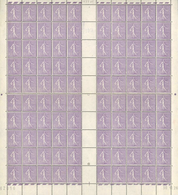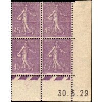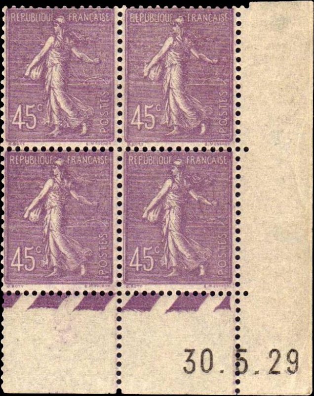 | Commentaire | Semeuse lignée. Nota Les ombres portées sur la Semeuse sont mal positionnées par rapport au soleil, de plus elle sème contre le vent Émis en novembre 1926 et maintenu en circulation jusqu’en juin 1932, le 45 centimes lilas du type Semeuse lignée constitue l’une des valeurs emblématiques de la fin des années 1920. Gravé par Louis-Eugène Mouchon d’après l’œuvre d’Oscar Roty, ce timbre reprend la célèbre allégorie de La Semeuse semant à contre-vent, ici sur fond ligné, caractéristique visuelle propre à cette série.