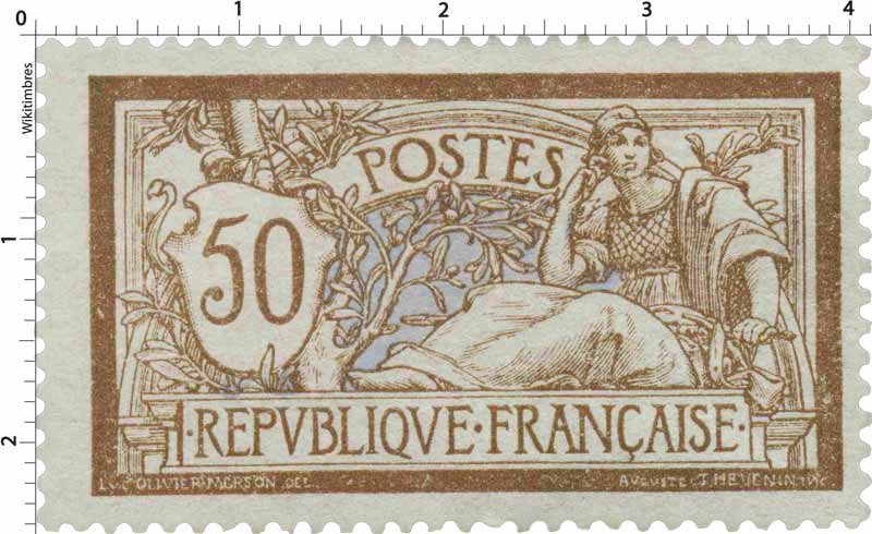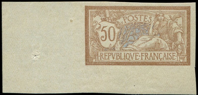 | Commentaire | Mis en vente le 4 décembre 1900, le 50 centimes brun et gris au type Merson s’inscrit dans la première série des grands timbres bicolores français, illustrés par Luc-Olivier Merson. Cette valeur était destinée aux affranchissements intermédiaires, notamment les lettres du deuxième échelon, certains envois recommandés et divers tarifs internationaux avant les ajustements tarifaires de 1906. Gravé par Auguste Thévenin, le Merson introduit dans la philatélie française un procédé d’impression innovant pour l’époque : deux passages successifs en typographie, l’un pour le cadre, l’autre pour le centre. Cette technique, encore imparfaitement maîtrisée au début du XXᵉ siècle, engendre une grande diversité de présentations : décalages entre les couleurs, variations de densité, gris plus clair ou tirant au bleu, et bruns plus ou moins chauds. Ces particularités expliquent l’intérêt soutenu des spécialistes pour cette valeur. Bien que les quantités d’émission exactes ne soient pas connues, le 50 c brun et gris figure parmi les valeurs courantes les plus diffusées du type Merson durant son cycle d’utilisation. En oblitéré, on rencontre principalement des cachets à date des grands centres postaux, où les volumes d’affranchissement étaient importants. Les plis réellement affranchis à 50 centimes — recommandés, imprimés lourds ou affranchissements mixtes — constituent les documents les plus recherchés pour illustrer la poste française des années 1900-1920. Retirée de la vente en décembre 1921, cette valeur est progressivement remplacée par les nouvelles émissions au type Semeuse et par les valeurs modernisées du début des années 1920. Aucun faux postal d’époque significatif n’est répertorié.