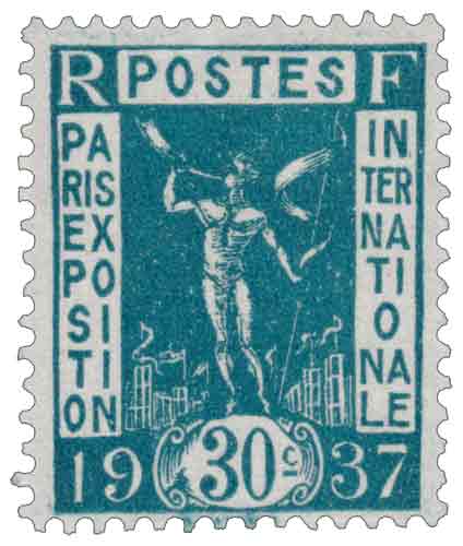 | Commentaire | Paris Exposition Internationale 1937 - Galanis. Ce timbre s’inscrit dans la série émise à l’occasion de l’Exposition internationale des arts et des techniques dans la vie moderne, organisée à Paris en 1937. L’émission de septembre 1936 anticipe cet événement majeur, destiné à affirmer le rôle culturel, artistique et industriel de la France dans un contexte international tendu. Le dessin est confié à Démétrios Galanis, artiste d’origine grecque naturalisé français, figure reconnue de l’art moderne et proche des milieux intellectuels parisiens. La gravure est réalisée par Gabriel-Antoine Barlangue, dont le travail en typographie restitue avec précision la composition graphique et la symbolique de l’émission. Le visuel, sobre et fortement structuré, met en avant un clairon, symbole d’annonce et de rassemblement, évocation directe de l’appel aux nations et aux visiteurs autour de l’exposition à venir. Sur le plan postal, la valeur faciale de 30 centimes correspond à des usages bien définis, notamment l’affranchissement des imprimés pour l’étranger au premier échelon de poids, ce qui inscrit ce timbre dans une circulation internationale de l’information et de la communication, en cohérence avec la portée universelle de l’exposition. Imprimé en typographie, ce timbre appartient à une série dont les tirages ne sont pas officiellement connus, ce qui reste fréquent pour les émissions de cette période. Sa diffusion relativement brève, entre septembre 1936 et février 1937, en fait un timbre représentatif des émissions transitoires précédant les grandes manifestations nationales. |