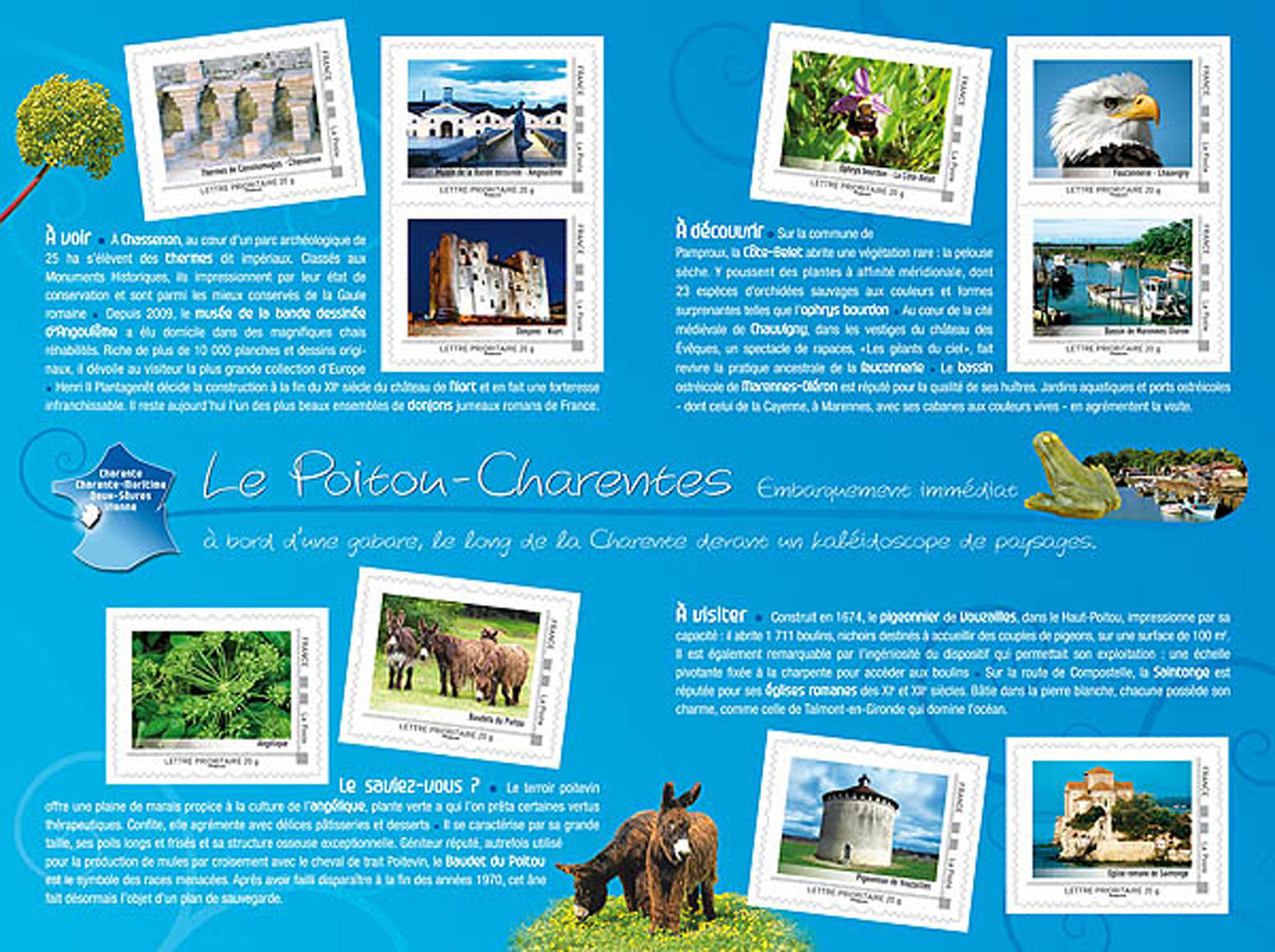 | Commentaire | Therme de Cassinomagus - Chassenon, Musée de la bande dessinée – Angoulême, Dijon – Niort, Angélique, Baudets du Poitou, Ophrys bourdon - La Côte Belet, Fauconnerie - Chauvigny, Bassin de Marennes d’Oléron, Pigeonnier – Vouzailles, Eglise romane de Saintonge |