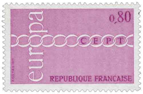 | Commentaire | Le timbre-poste français EUROPA de 0,80 franc émis en 1971 s’inscrit dans une édition particulière de la série européenne, marquée par la décision de la France d’émettre exceptionnellement deux figurines distinctes la même année afin de répondre à des usages postaux différents tout en affirmant une aspiration commune à la coopération continentale. Mis en vente générale le 10 mai 1971 après une vente anticipée le 8 mai à Paris et Strasbourg, ce timbre relève du régime international et reprend le motif commun adopté par la Conférence européenne des administrations des Postes et Télécommunications, organisation regroupant alors plus de vingt administrations postales engagées dans la construction européenne par le biais des échanges et des communications. Le dessin retenu, œuvre de l’artiste islandais Helgi Haflidason, a été sélectionné par un jury international et se présente sous la forme d’une chaîne stylisée intégrant le mot EUROPA, composition volontairement épurée destinée à transcender les références nationales. Les maillons tendus de cette chaîne symbolisent l’union étroite, la coopération continue et l’effort collectif des peuples européens à une époque où la philatélie constitue encore un support de communication de masse à forte portée symbolique. En 1971, plus de vingt pays participent à cette émission commune, faisant du timbre EUROPA l’un des rares objets circulant simultanément dans une grande partie de l’Europe avec un message graphique partagé. Pour la France, ce timbre à 0,80 franc est destiné à l’affranchissement de la lettre simple pour l’intérieur, assurant une diffusion très large de ce symbole d’unité. Gravé en taille-douce par Georges Bétemps, il se distingue par une exécution soignée qui renforce la lisibilité et la force visuelle du motif malgré sa simplicité apparente. Cette émission témoigne de la manière dont la politique postale française utilise le timbre comme vecteur d’idées, en l’occurrence la solidarité européenne, en associant rigueur graphique, neutralité symbolique et circulation quotidienne. Par son iconographie abstraite et son important tirage, le timbre EUROPA 1971 à 0,80 franc constitue ainsi un jalon représentatif de la philatélie européenne du début des années 1970, période où l’unité se cherche et s’affirme par des signes communs accessibles à tous. Article rédigé pour WikiTimbres |