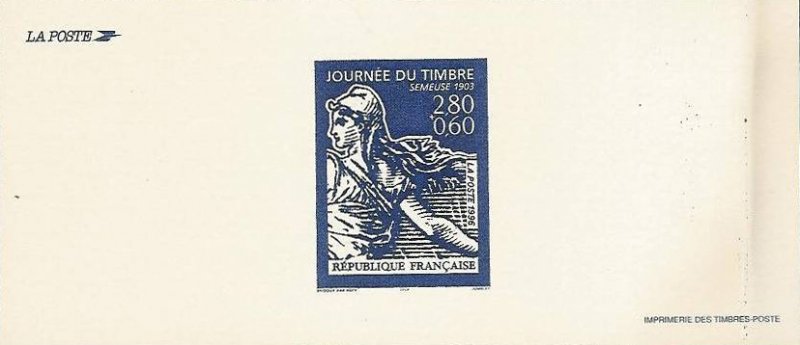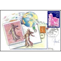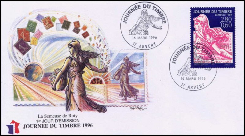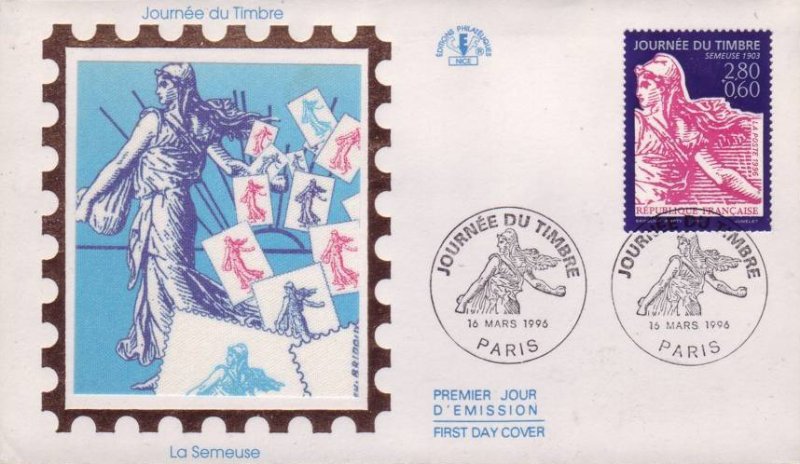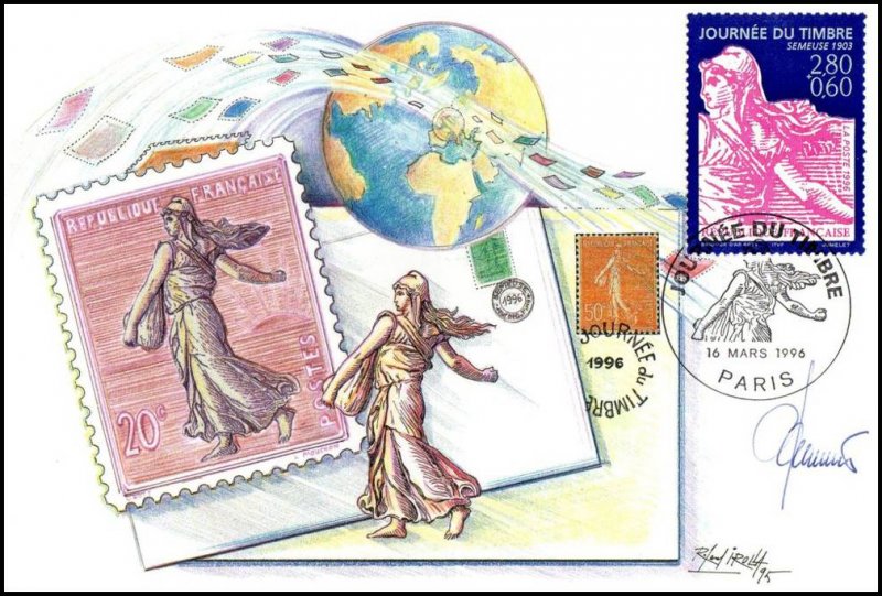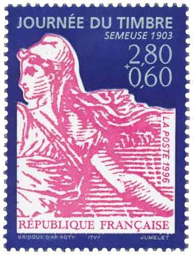 | Description | Journée du Timbre 1996. Semeuse 1903 avec surtaxe, œuvre d'Oscar Roty (1846-1911), dessinateur de monnaies et de timbres (la semeuse), né à Paris |
