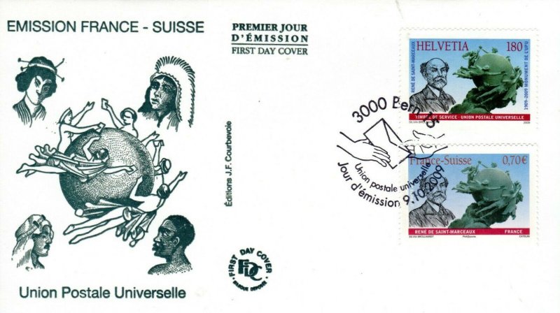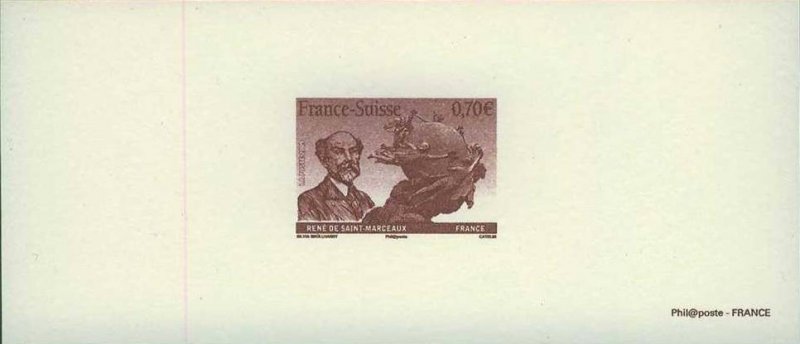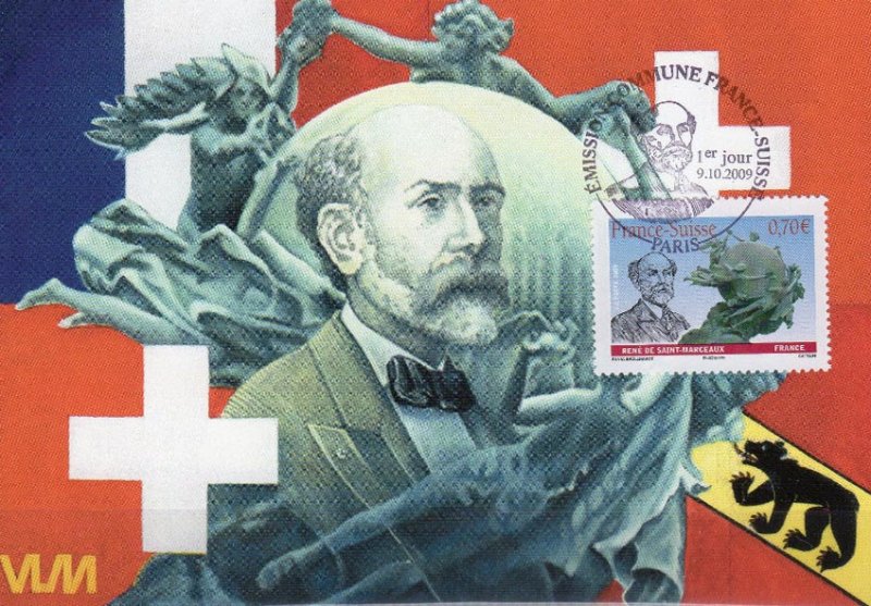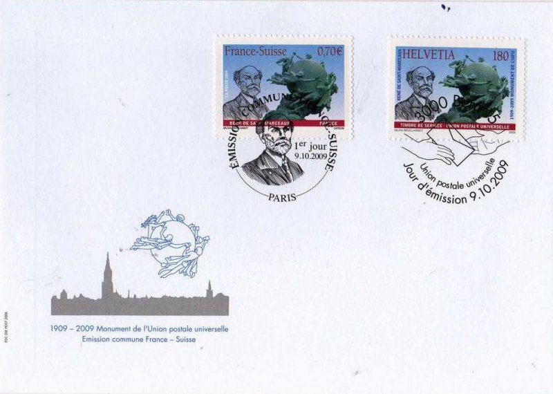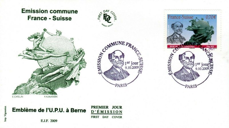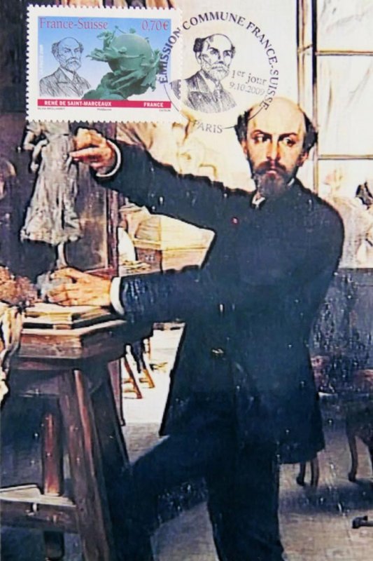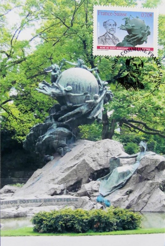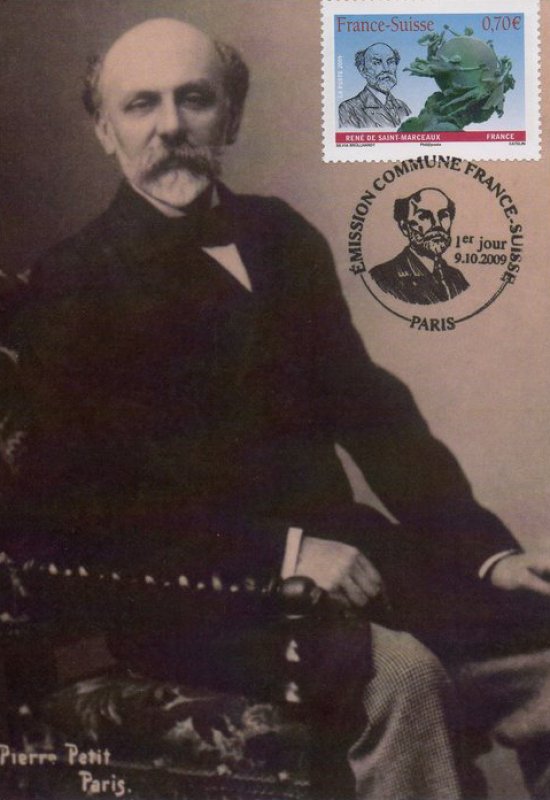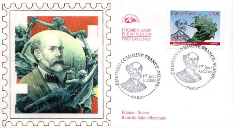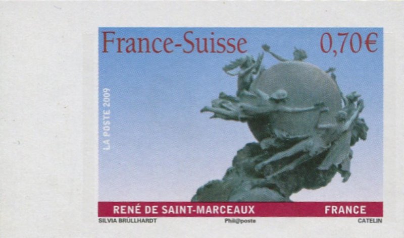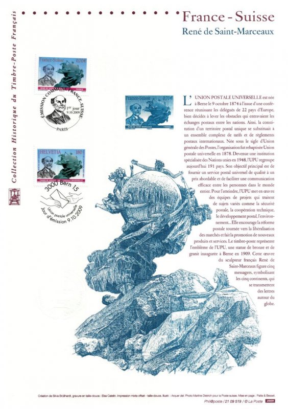 | Commentaire | La mise en vente anticipée a lieu le 9 octobre à l'ambassade de Suisse à Paris, et les 9 et 10 octobre à Reims, ville natale du sculpteur, dont le portrait est repris sur le cachet premier jour mis en page par Gilles Bosquet. L’émission commune avec la Suisse met à l’honneur la statue de bronze et de granit, emblème de l’Union Postale Universelle (UPU) à Berne. Cette statue est l’œuvre du sculpteur français René de Saint-Marceau, lui-même représenté sur le timbre. Cette statue incarne la mission véritablement universelle de l’UPU. Elle représente cinq messagers, symbolisant les cinq continents, qui se transmettent des lettres autour du globe. Émission conjointe avec la Suisse |