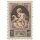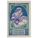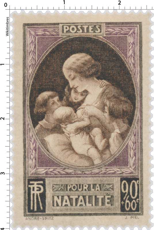 | Commentaire | "Histoires de timbres" Le timbre semi-postal à 90 centimes brun-lilas et brun-rouge, dessiné par André Spitz et gravé par Jules Piel, illustre une allégorie de la maternité et de la famille nombreuse dans le cadre de la campagne nataliste de la Troisième République face au déclin démographique, peu avant l'adoption du Code de la famille. Imprimé en taille-douce rotative bicolore par feuilles de 25, dentelé 13, il est mis en vente le 15 juin 1939 avec une surtaxe de 60 centimes au profit de l'Alliance Nationale pour l'Accroissement de la Population et sert à l'affranchissement des lettres intérieures de premier échelon jusqu'au changement tarifaire de décembre 1939. Tiré à 600 000 exemplaires, il forme une paire thématique avec la valeur à 70 centimes + 80 centimes. |