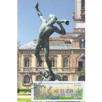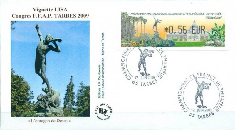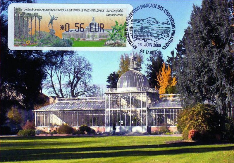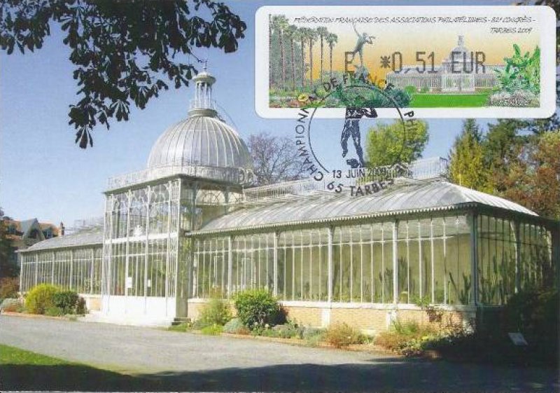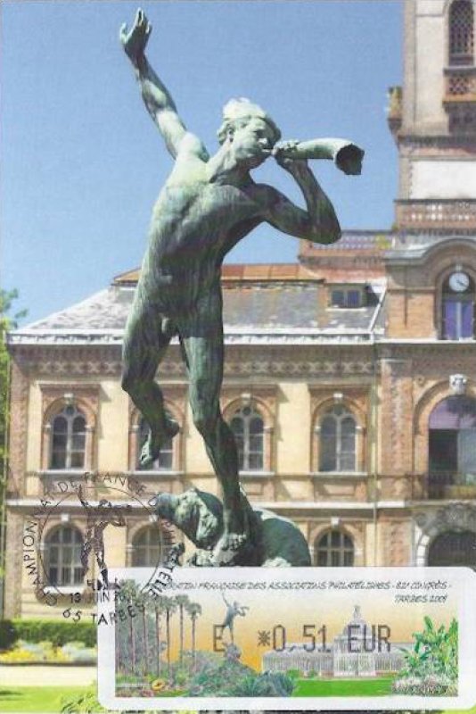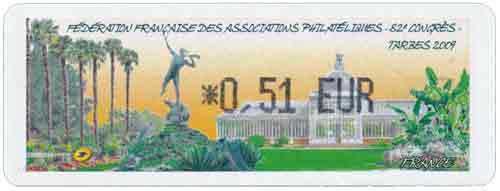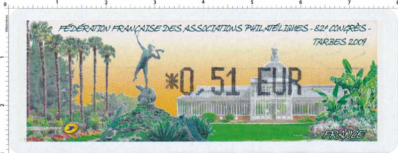 | Commentaire | 60 200 EXEMPLAIRES EN ROULEAUX, cette vignette représente le jardin Massey, classé jardin remarquable, de 11 hectares. Au premier plan la sculpture en bronze ''L'ouragan de Desca, en arrière plan, la serre du jardin Visuel : les "Trachycarpus fortunei" (palmiers dïoïques) du jardin Massey "Jardin remarquable", avec la sculpture en bronze ''L'ouragan" de Desca et la serre du jardin (l'Orangerie, avec son dôme demi-sphérique avec clocheton). - Edmond DESCA (1855-1918, sculpteur) : statue en bronze "Ouragan", le personnage souffle dans une corne, un chien effrayé à ses pieds (d'après un plâtre de 1883), en place dans le parc du jardin Massey, devant le Musée. |