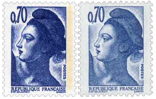 | Description | Liberté d'après le tableau 'La Liberté guidant le peuple', variété de la double frappe (timbre de gauche) |