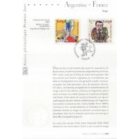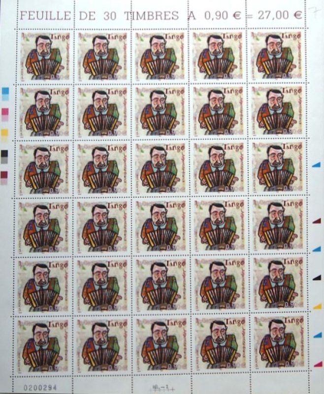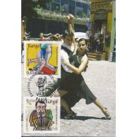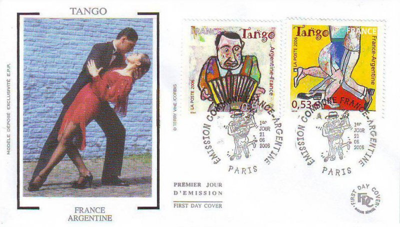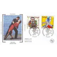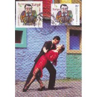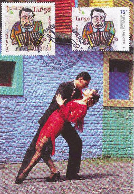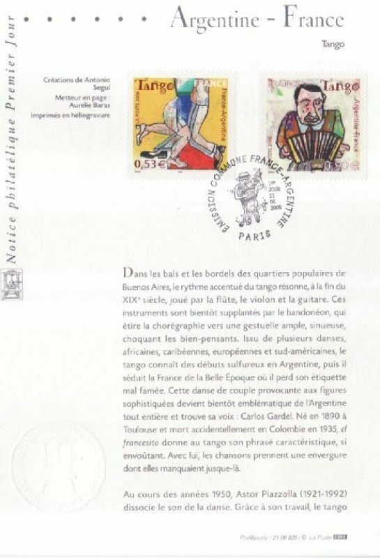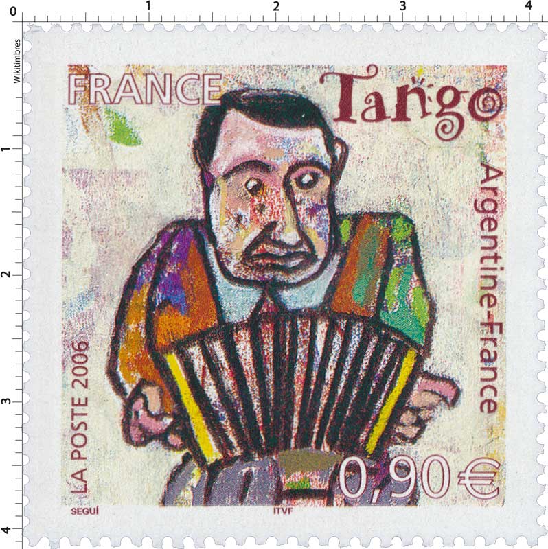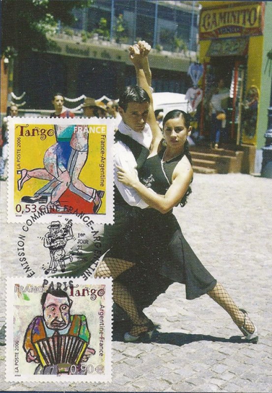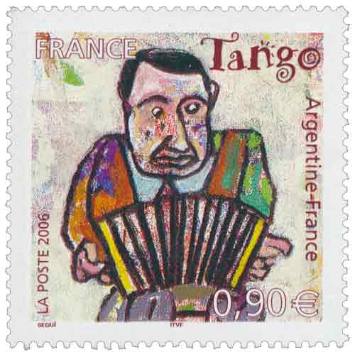 | Commentaire | Tous les ans, la Poste française procède à au moins une émission commune avec un pays étranger – la Slovaquie et l’Inde en 2003, la Belgique et le Canada en 2004, la République Tchèque et la Cité du Vatican en 2005. En 2006 a été inscrite une émission commune avec l’Argentine sur le thème du tango. Le tango, musique et danse, a connu son apogée à Buenos Aires dans les années 40 et a failli disparaître sous la dictature pour renaître et retrouver une dimension internationale dans les années 80. Danse de couple, danse sociale, poésie populaire, respect des codes … le tango est tout cela … une « pensée triste qui se danse », si justement mis en image par le peintre argentin Antonio Seguí. Émission commune avec l'Argentine |
