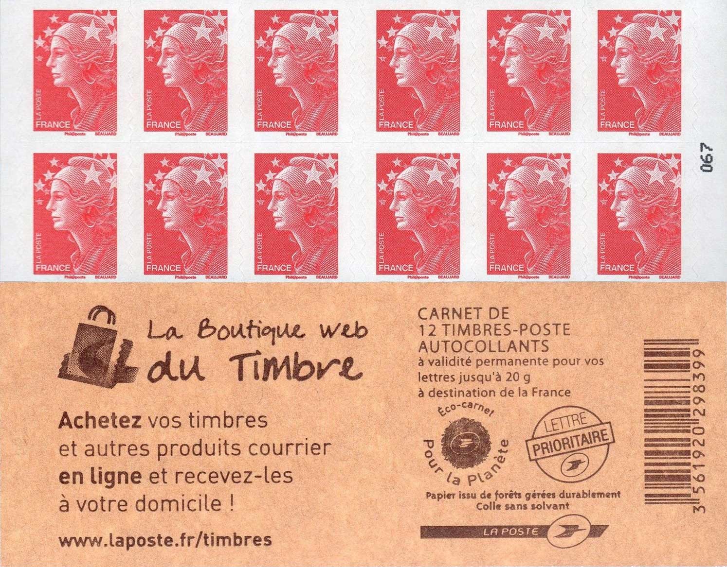 | Description | Carnet Marianne - Couverture “La Boutique Web du Timbre” - 12 TP autocollants - Tarif lettre 20 g France |
