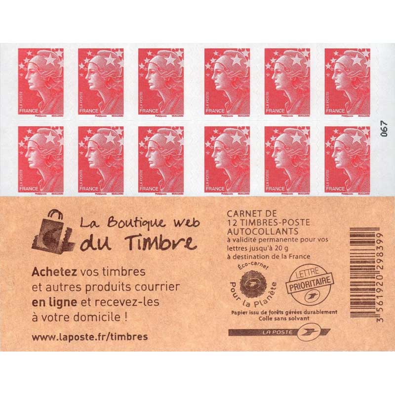 | Description | Carnet Marianne - Couverture “La Boutique Web du Timbre” - 12 TP autocollants - Tarif lettre 20 g France |