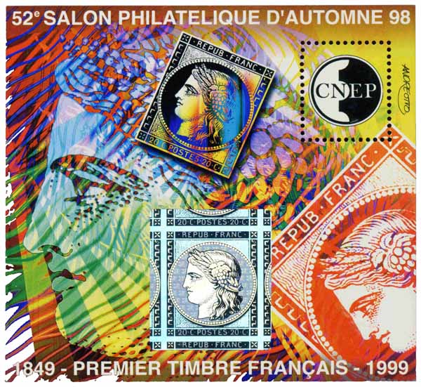 | Commentaire | Visuel : surimpression du visuel de Cérès 1849 + deux TP "Cérès", avec les 20 c. noir et 1 f rouge clair, dit vermillon (partiel). + le TP Cérès, reproduction partielle d'une feuille (au centre-bas), est argenté et de type hologramme, avec les dates 1849-1999 + un timbre non postale du logo CNEP. |