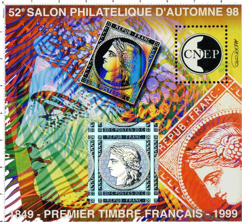 | Commentaire | Visuel : surimpression du visuel de Cérès 1849 + deux TP "Cérès", avec les 20 c. noir et 1 f rouge clair, dit vermillon (partiel). + le TP Cérès, reproduction partielle d'une feuille (au centre-bas), est argenté et de type hologramme, avec les dates 1849-1999 + un timbre non postale du logo CNEP. |