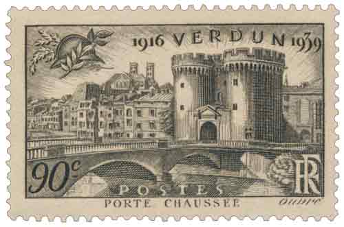 | Commentaire | Verdun (1916-1939) - 23e anniversaire de la Victoire - Porte Chaussée. Le timbre commémoratif à 90 centimes brun-gris, dessiné et gravé par Achille Ouvré, représente la Porte Chaussée, porte monumentale du XIVe siècle flanquée de deux tours jumelles, entrée principale de Verdun sur la Meuse et symbole de la cité fortifiée épargnée par les destructions massives lors de la bataille de 1916 dont il marque le vingt-troisième anniversaire. Imprimé en taille-douce rotative par feuilles de 50, dentelé 13, il est mis en vente le 23 juin 1939 pour l'affranchissement des lettres intérieures simples, retiré le 5 octobre 1939 et tiré à 3,89 millions d'exemplaires. |