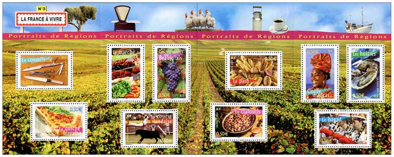 | Commentaire | Portraits de Régions – LA FRANCE À VIVRE. La série philatélique Portraits de régions a été inaugurée en 2003. Elle célèbre la France, ses coutumes locales, ses traditions populaires, sa gastronomie, son architecture … Le troisième bloc rend hommage aux diverses régions de France à travers : - 5 timbres gastronomie : le clafoutis, le pain, la quiche lorraine, une huître de Marennes, le Beaujolais - 5 timbres artisanat et coutumes locales : le bagad de Lann Bihoué, la coutellerie de Thiers, le marché de Nice, une course de vachettes landaises à Dax, une coiffe madras de Guadeloupe. |