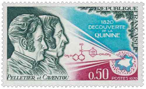 | Commentaire | Émis en 1970, le timbre commémoratif consacré à la découverte de la quinine rend hommage à l’apport décisif de Pierre-Joseph Pelletier et Joseph-Bienaimé Caventou, dont la collaboration scientifique, engagée à Paris dès 1817 dans le laboratoire de la rue Jacob, marque une étape fondatrice de la chimie organique et de la pharmacologie moderne, en particulier par l’isolement méthodique des alcaloïdes végétaux ; après des travaux précurseurs sur la cholestérine puis l’extraction de substances actives majeures telles que la strychnine, la brucine ou la vératrine, leurs recherches aboutissent en 1820 à l’isolement de la quinine à partir des écorces de quinquina, avancée thérapeutique déterminante contre le paludisme qui transforme durablement la pratique médicale mondiale ; l’émission philatélique s’inscrit dans une tradition française valorisant les découvertes scientifiques à impact humanitaire, en soulignant à la fois la rigueur expérimentale des deux savants et leur choix éthique de publier leurs résultats sans chercher à en tirer un monopole lucratif, favorisant ainsi une diffusion rapide et universelle du traitement ; par sa composition gravée en taille-douce, le timbre associe symboliquement les figures des chercheurs et l’évocation botanique et chimique de leur découverte, rappelant que la quinine demeure, malgré l’essor ultérieur de la chimiothérapie de synthèse, une référence thérapeutique dont l’efficacité et la faible induction de résistances ont sauvé et continuent de sauver des millions de vies, faisant de cette émission un jalon emblématique de la philatélie scientifique française. Article rédigé pour WikiTimbres |