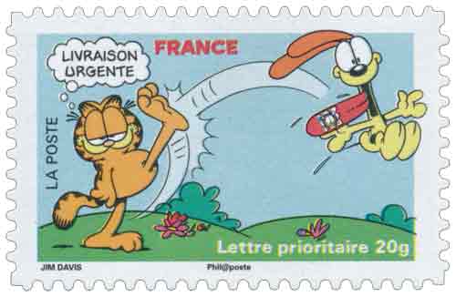 | Commentaire | La mise en vente anticipée a lieu le 18 septembre à Saint-Brice-Courcelles avec un cachet illustré du chat Garfield de face et souriant, sans mention « premier jour ». Timbre sans millésime |