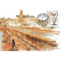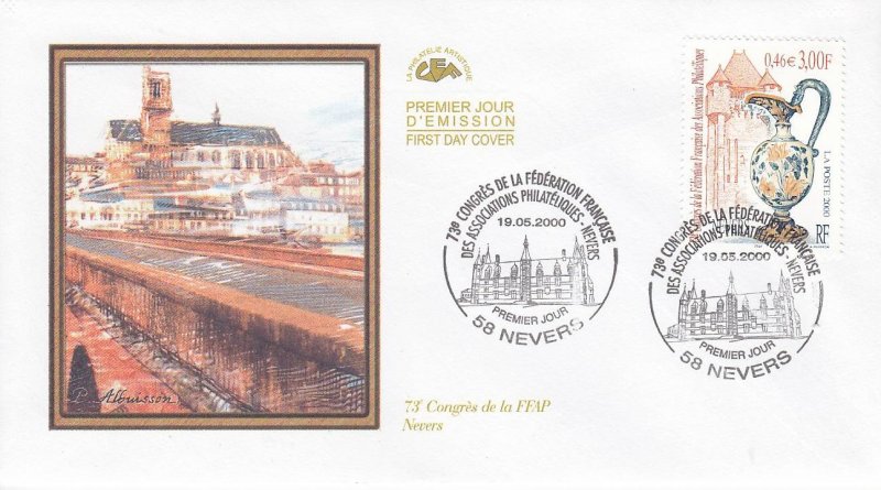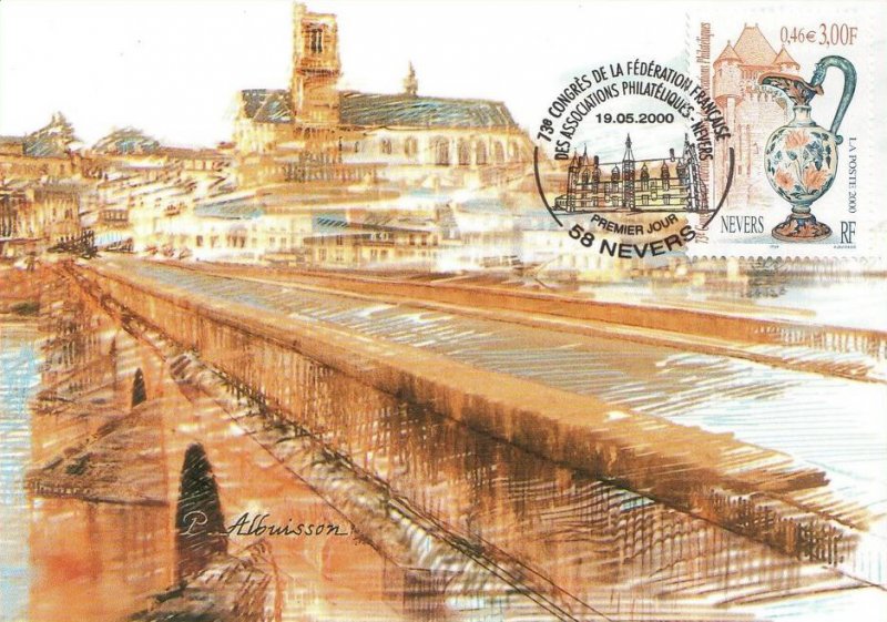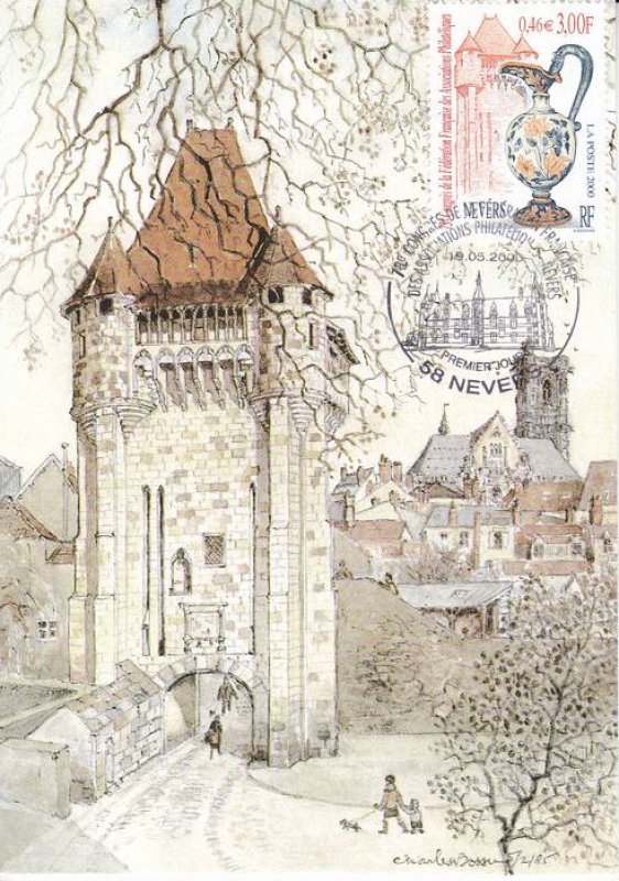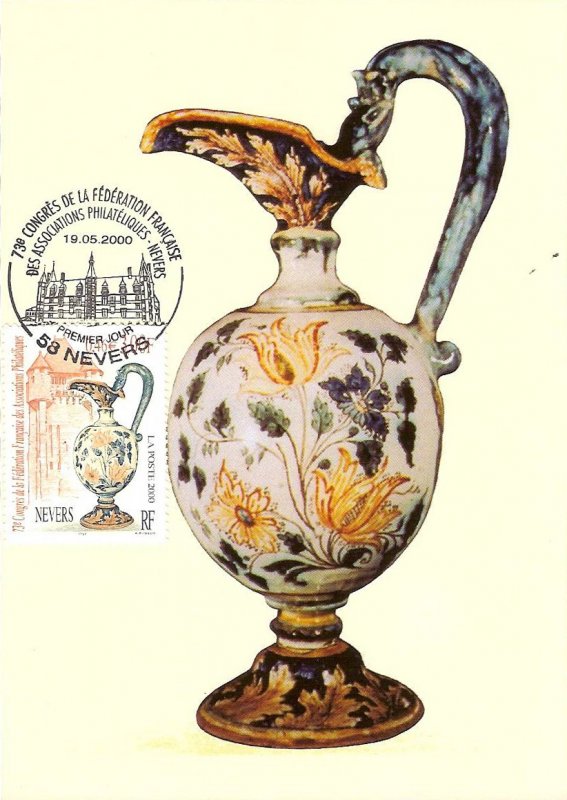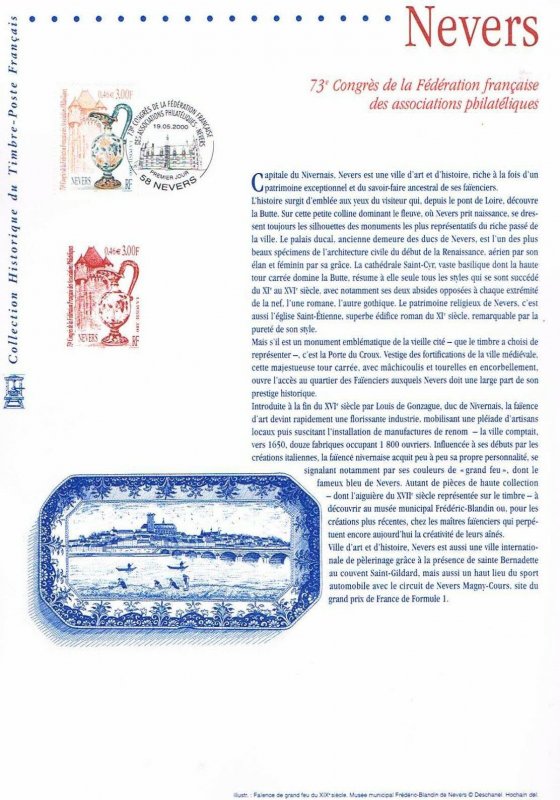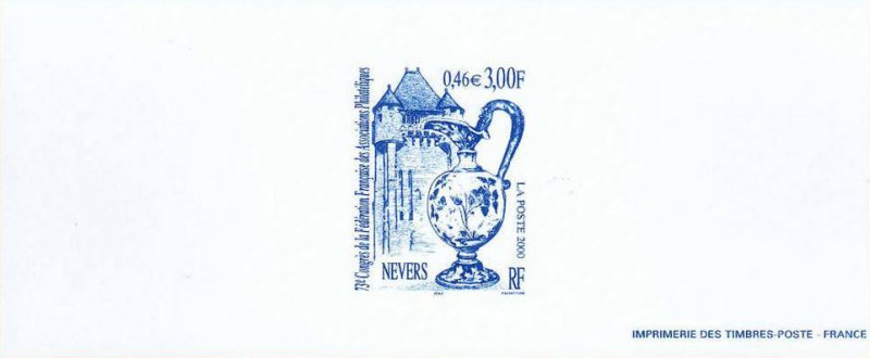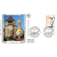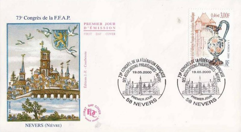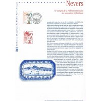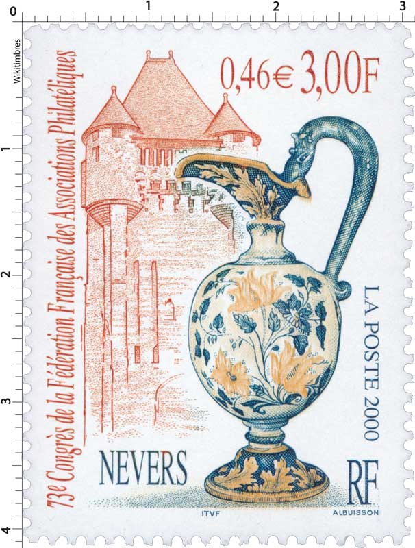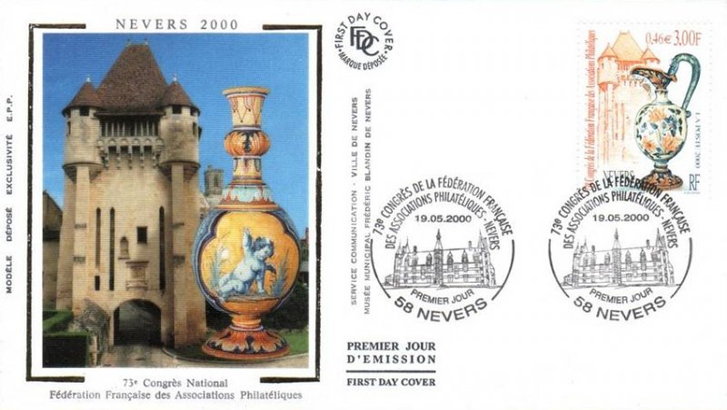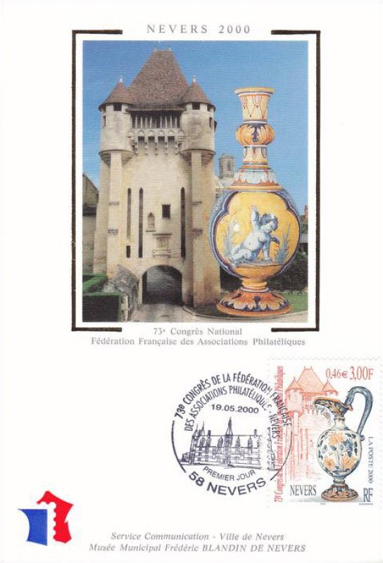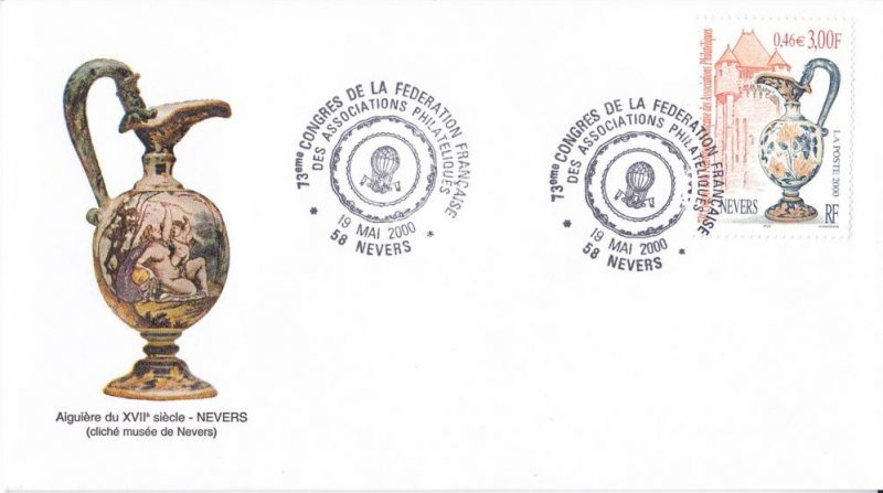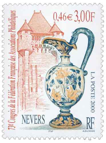 | Description | 73e Congrès de la Fédération française des associations philatéliques, à Nevers. Représentation d'une aiguière en faïence de Nevers et de la porte du Croux |