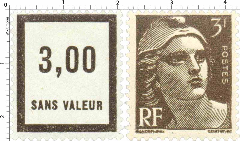 Timbre : 1945 SANS VALEUR Mesures Format d'imp 18 x 22 mm Dents incluses 20 x 24 mm Forme vertical Phosphore Non Impression Typographie rotative Complément xxxxx Couleur brun-foncé Valeur 3,00 Dentelure - Emis en feuille de 100 TP Quantité - Auteurs Dessinateur xxxxx Graveur xxxxx Mise en page xxxxx Mentions - Numéros & Dates N° Philatelix - N° Michel - Date d'émission 01/01/1945 Date de retrait - Classements Groupe Les timbres fictifs, émission de 1945 Catégorie Fictif Familles Usage - Régions - Départements - Description Rapprochement avec le timbre POSTE-1945-48 Commentaire - Mes timbres & notes personnelles www.wikitimbres.fr