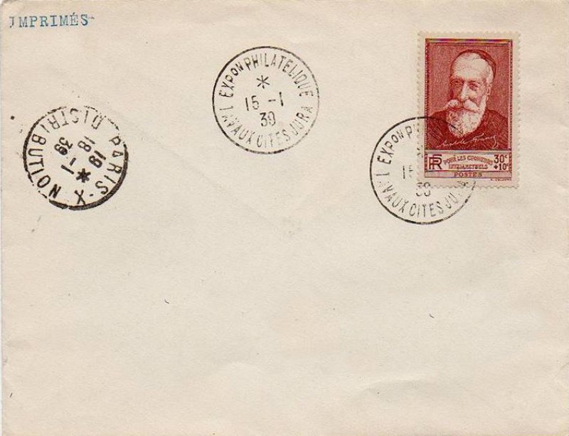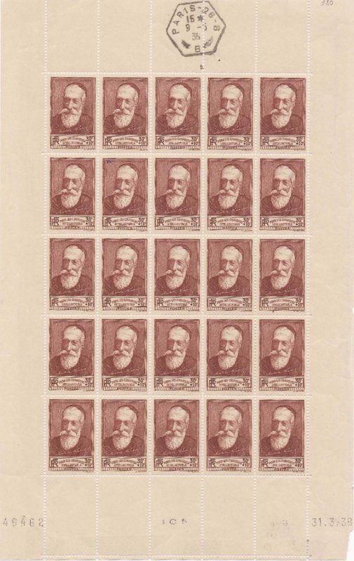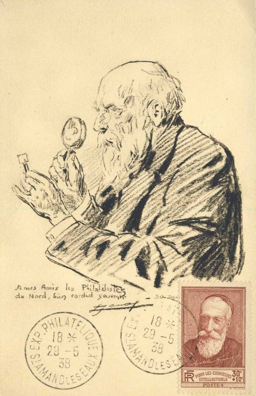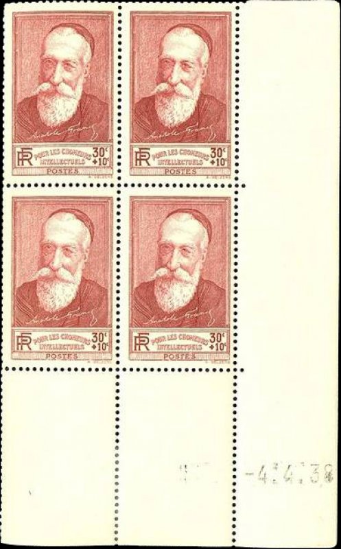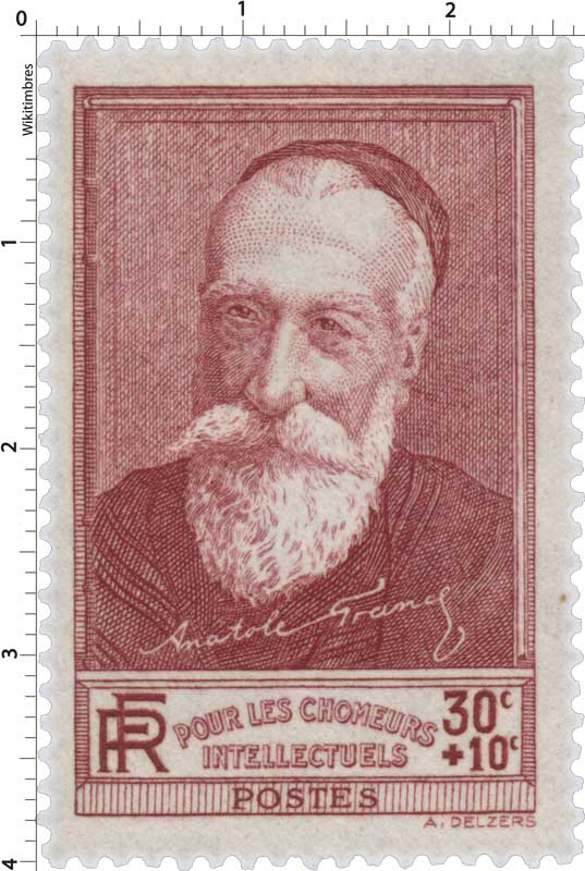 Émis le 9 mai 1938, ce timbre commémoratif vertical rend hommage à Anatole France (1844-1924), écrivain français et Prix Nobel de littérature en 1921. Ce timbre est un exemple de l'engagement social de la Poste, car les bénéfices de la surtaxe étaient destinés aux chômeurs intellectuels, une préoccupation sociale importante des années 1930.
