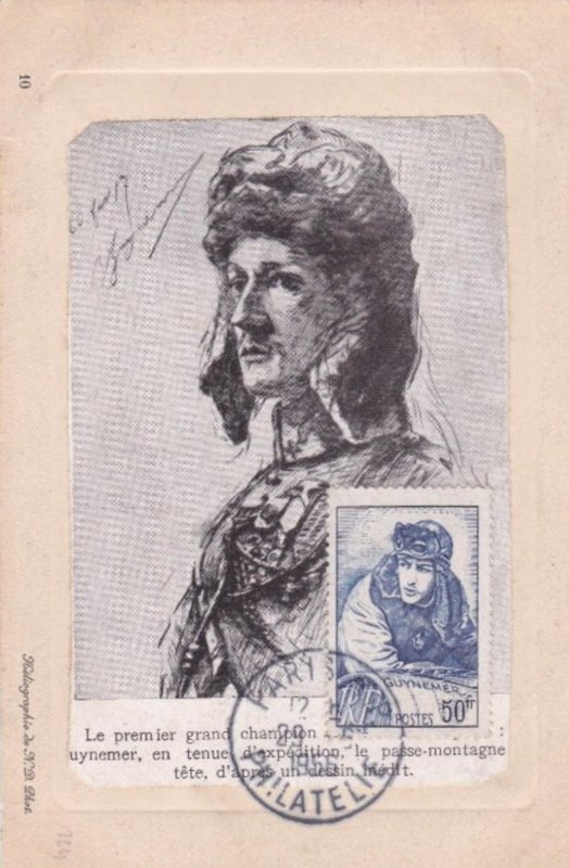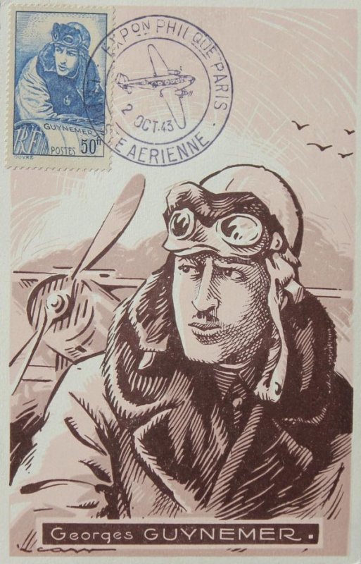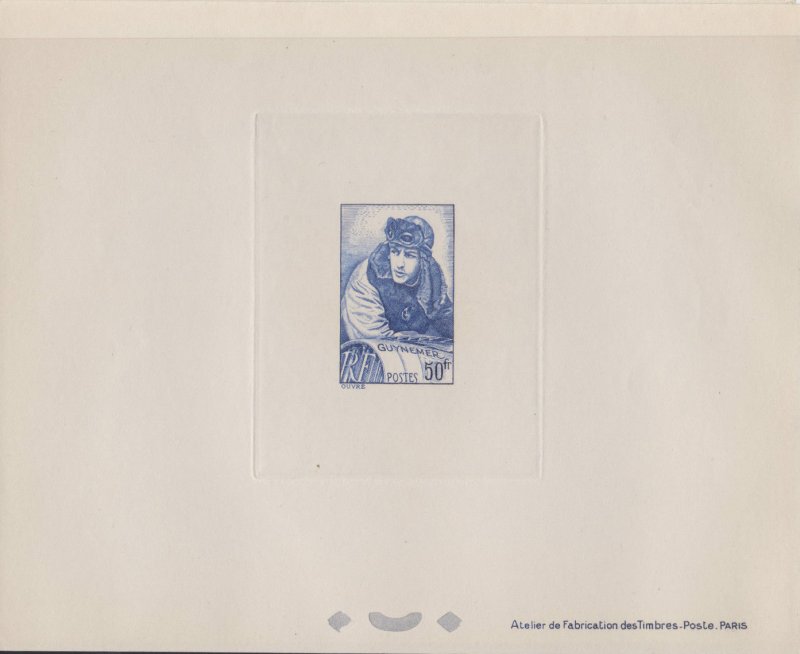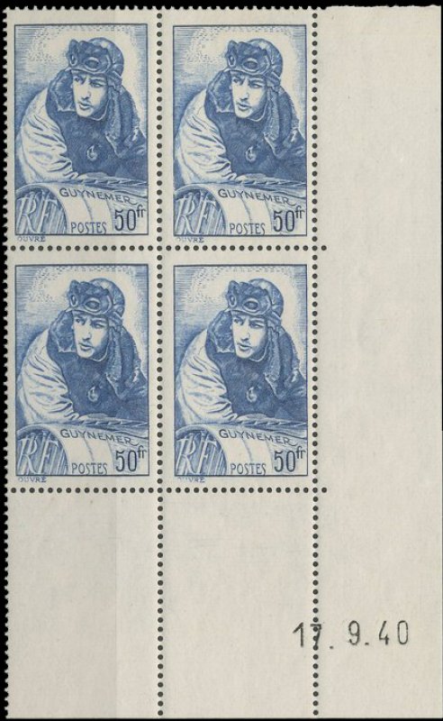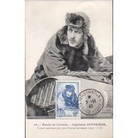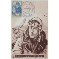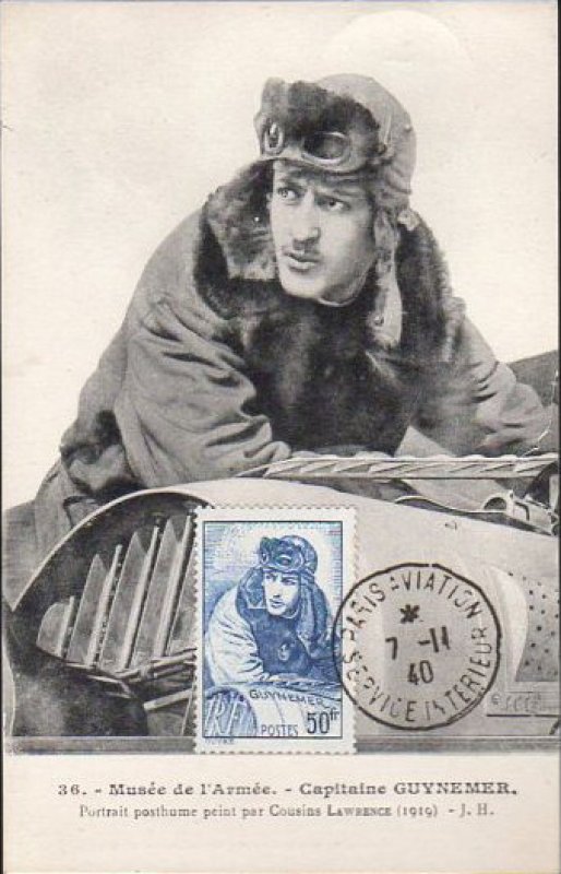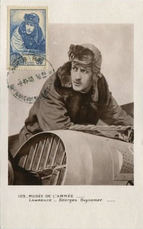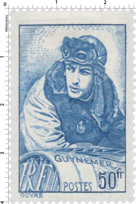 | Commentaire | Visuel : Georges Guynemer, d'après une œuvre posthume une peinture à l’huile du peintre J. Cousins Lawrence datant de 1918/19. Le capitaine y apparaît en tenue de pilote (blouson à col de fourrure, bonnet et lunettes d’aviateur), penché sur la partie avant de son avion. Il regarde vers l’horizon, l’air déterminé et absorbé, prêt |