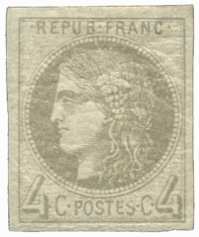 | Commentaire | Cérès - Émission de Bordeaux. Report 2 (2 points et un trait dans le O de POSTE) . Retrait 1872 Le 4 centimes gris, n°41B, appartient à l’Émission de Bordeaux, produite dans l’urgence entre la fin de 1870 et les premiers mois de 1871. Après la capitulation de Napoléon III le 2 septembre 1870 et l’encerclement de Paris, les ateliers officiels deviennent inaccessibles, entraînant une pénurie de timbres dans le territoire non envahi. Le gouvernement de la Défense nationale, replié à Bordeaux, décide alors d’émettre des timbres provisoires au type Cérès, renouant avec l’effigie républicaine. Privée des équipements typographiques de Paris, la Monnaie de Bordeaux adopte la lithographie, seule technique immédiatement disponible. L’usure rapide des pierres lithographiques oblige les imprimeurs à multiplier les matrices pour maintenir la production. Le n°41B correspond au report 2, deuxième transfert du dessin de Cérès sur pierre, avec des caractéristiques propres liées au procédé lithographique et à l’ajustement progressif des traits. L’Émission de Bordeaux, marquée par ses reports successifs, ses nuances variables et les conditions précaires de sa fabrication, constitue un domaine d’étude majeur pour les collectionneurs. Le 4c gris report 2 illustre pleinement cette production improvisée, recherchée pour la diversité de ses états et pour le contexte historique exceptionnel dans lequel elle a été réalisée.