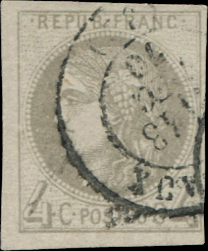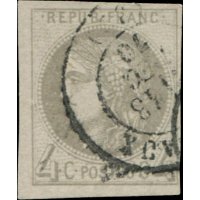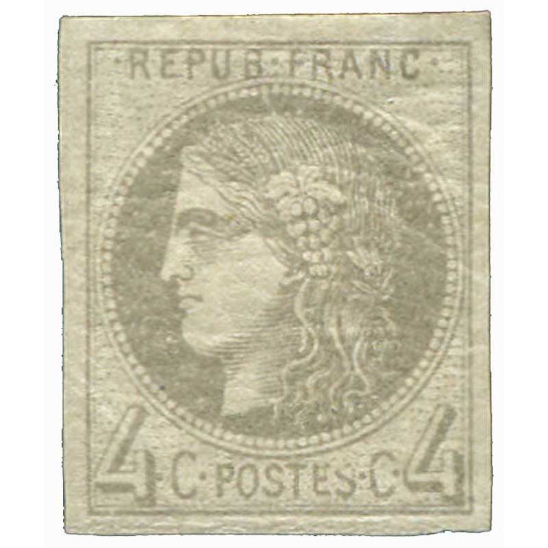 | Commentaire | Cérès - Émission de Bordeaux. Report 2 (2 points et un trait dans le O de POSTE) . Retrait 1872 Le 4 centimes gris, n°41B, appartient à l’Émission de Bordeaux, produite dans l’urgence entre la fin de 1870 et les premiers mois de 1871. Après la capitulation de Napoléon III le 2 septembre 1870 et l’encerclement de Paris, les ateliers officiels deviennent inaccessibles, entraînant une pénurie de timbres dans le territoire non envahi. Le gouvernement de la Défense nationale, replié à Bordeaux, décide alors d’émettre des timbres provisoires au type Cérès, renouant avec l’effigie républicaine. Privée des équipements typographiques de Paris, la Monnaie de Bordeaux adopte la lithographie, seule technique immédiatement disponible. L’usure rapide des pierres lithographiques oblige les imprimeurs à multiplier les matrices pour maintenir la production. Le n°41B correspond au report 2, deuxième transfert du dessin de Cérès sur pierre, avec des caractéristiques propres liées au procédé lithographique et à l’ajustement progressif des traits. L’Émission de Bordeaux, marquée par ses reports successifs, ses nuances variables et les conditions précaires de sa fabrication, constitue un domaine d’étude majeur pour les collectionneurs. Le 4c gris report 2 illustre pleinement cette production improvisée, recherchée pour la diversité de ses états et pour le contexte historique exceptionnel dans lequel elle a été réalisée.